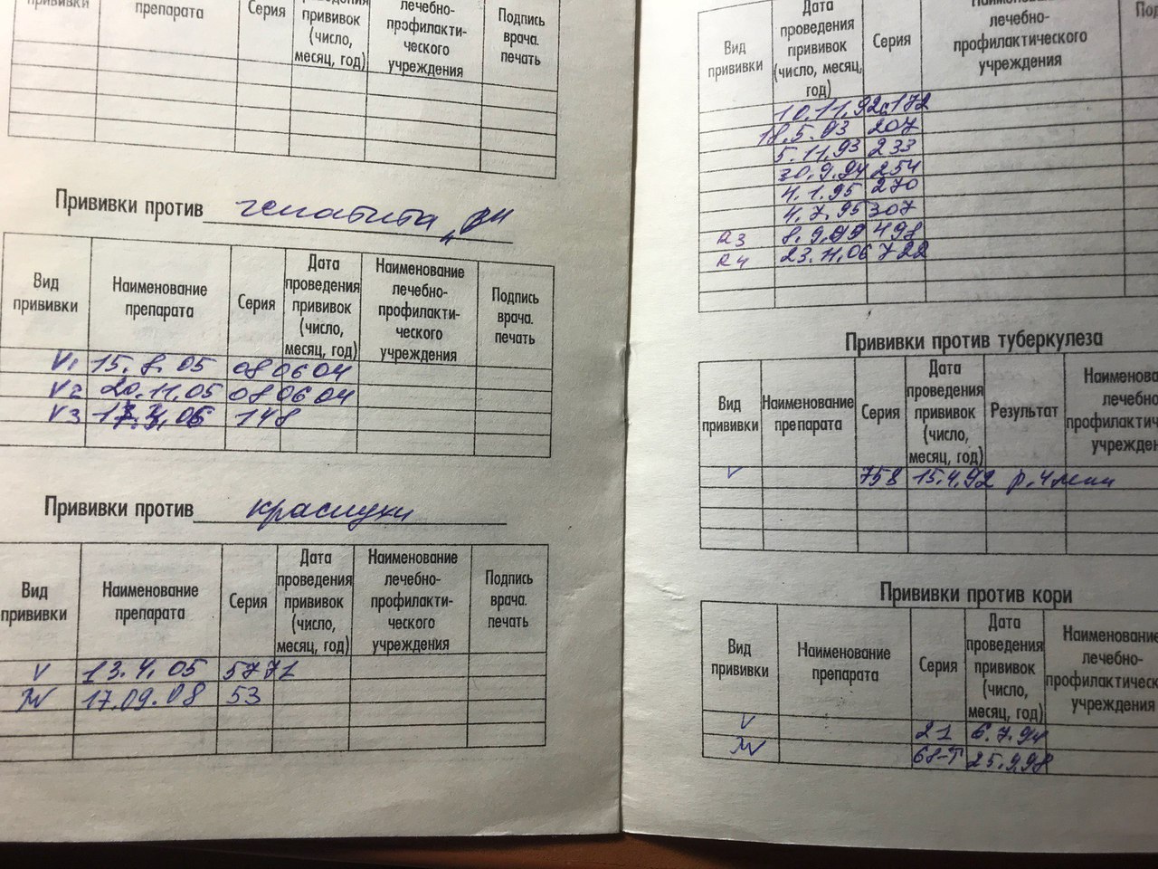 Мне 42 года (1976 г.р.) Медкомиссия будет в конце марта. В детской карточке записаны такие прививки (во вложении). Гриппозную прививку мне делать не нужно ( я так поняла), т.к. "влетать" в США я буду после 31 марта.