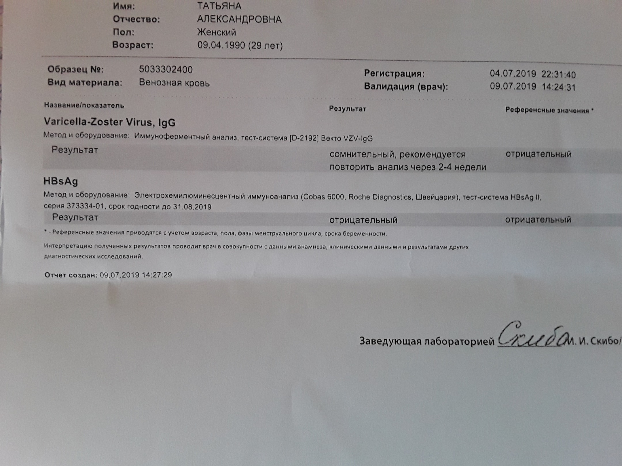 Здравствуйте! Подскажите, пожалуйста, подойдут ли такие результаты анализа крови на ветрянку? Ветрянкой я болела, и детская карта на руках. Я записана на обследование 16.07. Помогите, что мне делать?
