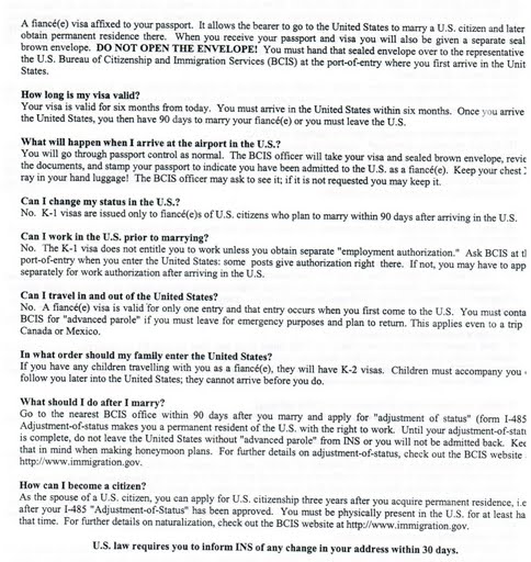 Erie писал(а): luckynata писал(а): Надеюсь, Вам помогут сылки на официальные сайты и документы http://kb.immigrationdirect.com/Knowled ... iving-visa По этой ссылке говорится что вообще надо подавать в течение 90 дней пока виза не закончилась Цитата: Fiancés wishing to live in the United States will need to apply for their green card within the 90 days that they’re allowed in the United States on the fiancé visa, using a procedure called adjustment of status. The process of getting a green card in the United States is called “adjustment of status.” Кстати, я не знаю кто вам дружно сказал  , но это была точно не я. Я только говорила что когда иммиграционные службы отлавливают нелегала, они говорят ему  Прошу прощения, поняла неверно И таки да, перечитали вдвоем с мужем, подивились вот этому "Fiancés wishing to live in the United States will need to apply for their green card within the 90 days that they’re allowed in the United States on the fiancé visa, using a procedure called adjustment of status. The process of getting a green card in the United States is called “adjustment of status"... Думаю все же, что акцент нужно сделать на это: 90 days that they’re allowed in the United States on the fiancé visa т.е находиться женихам\невестам позволено в течение 90 дней, а потом-то они и не женихи\невесты, а жёны\мужья. Короче, продолжаю поиски истины