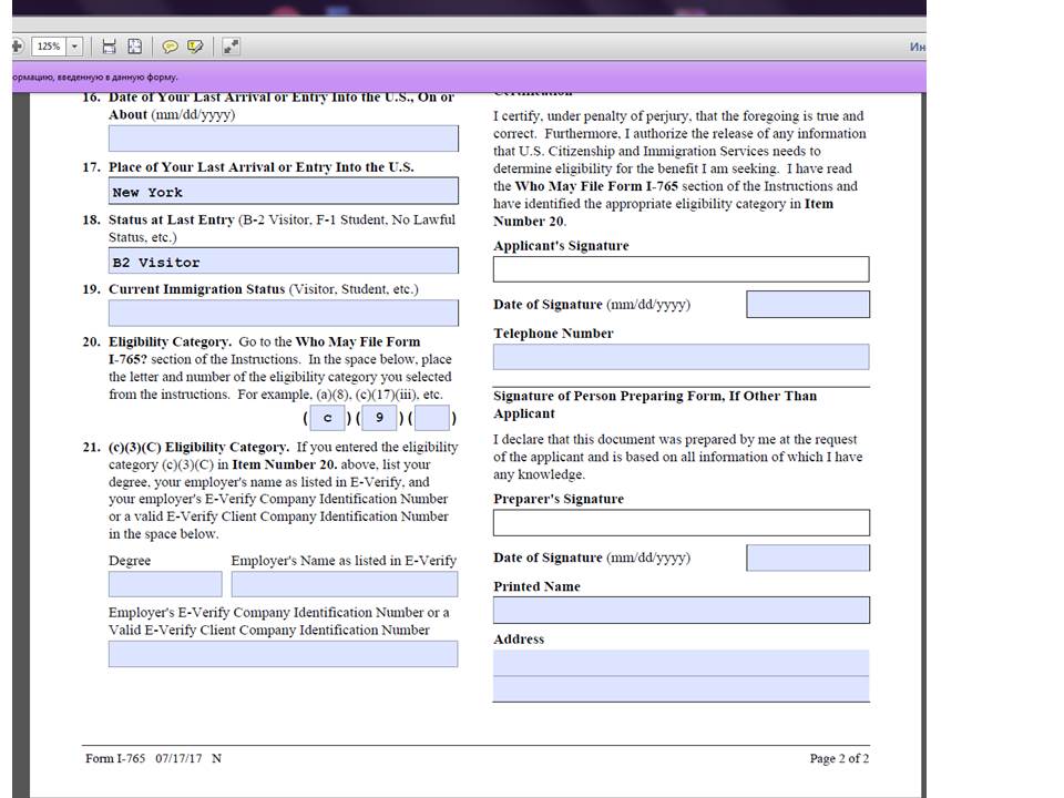 lolli123 писал(а): Виктория спасибо) про визитор я поняла. но там есть такой вопрос №20/ вот что там (с)(9) в первых двух клетках? Да, (C) (9), т.к. Вы получаете EAD на основе AOS (как супруга гражданина США).