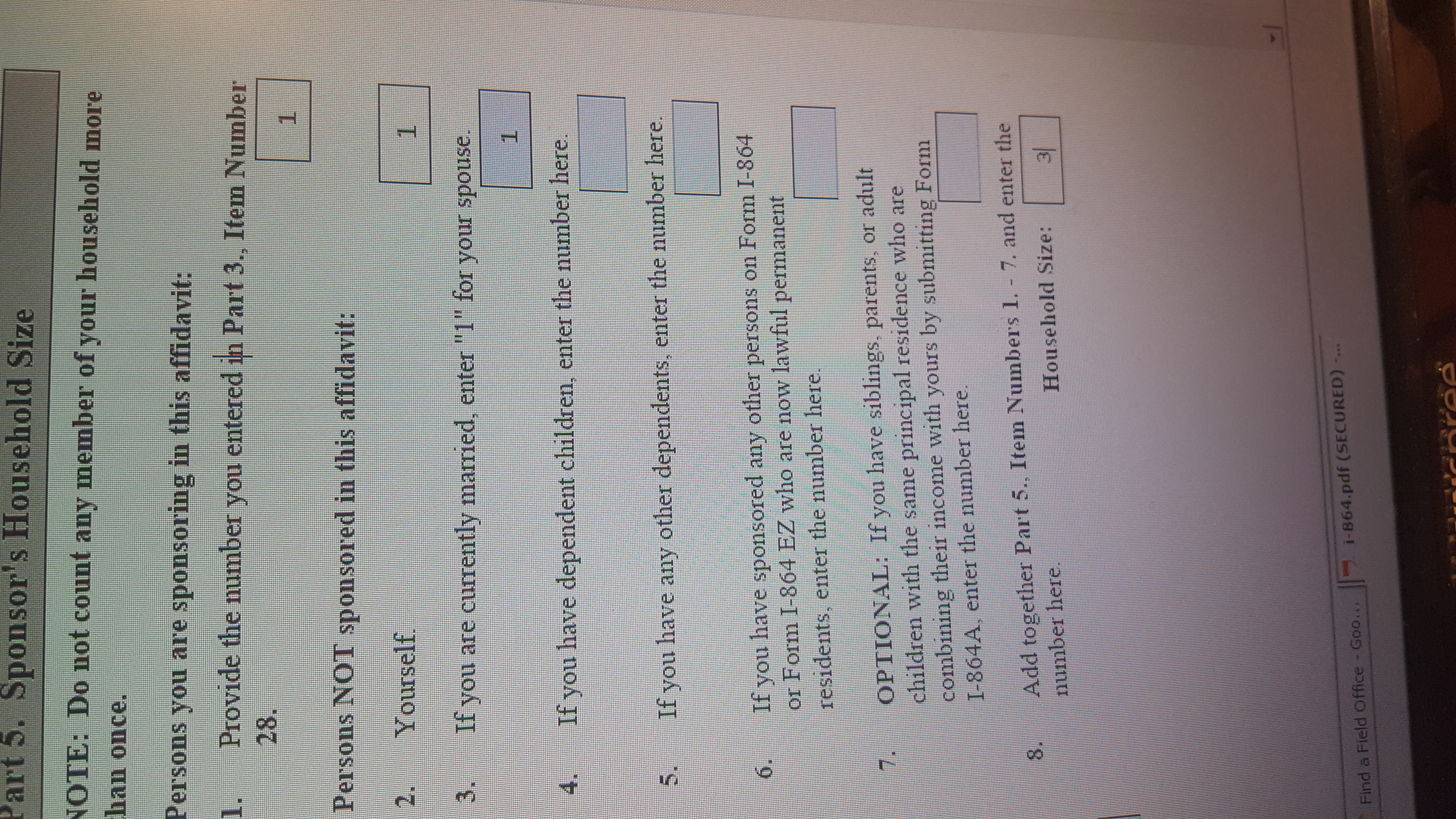 Про саму форму - часть 6, пункты 1-2 со всеми подпунктами - только про твоего мужа, то есть только его доход в этом месте указывать. Если есть ко-спонсоры, либо есть еще кто-то, файлящий вместе с мужем - это Персоны из следующих строчек. Ты вроде как тоже попадаешь в эту категорию, НО: идем в инструкцию, где читаем - если доход в пункте 2 превышает 125% уровня бедности, то остальные строчки доходов заполнять не надо - переходишь в пункт 18, где тоже только доходы мужа надо использовать.