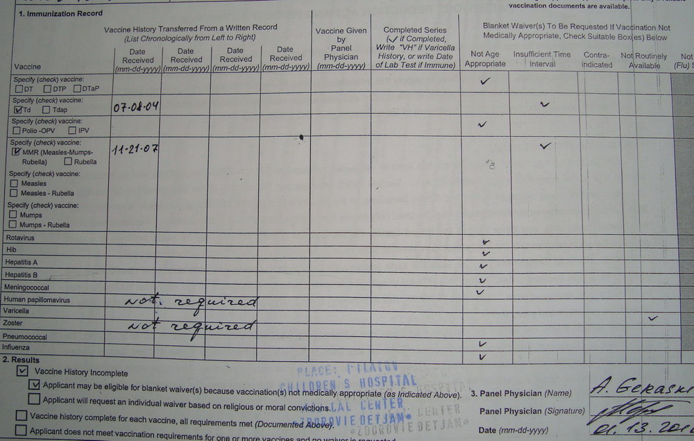 Девочки, нужна ваша помощь. Вопрос по медосмотру. Я можно сказать без знания языка, поэтому супруг будет разговаривать с доктором, а я тока глазками моргать...  , так вот боюсь не проморгать, как бы мне не влепили какую-нибудь лишнюю прививку.. Девочки, кто знает, посмотрите мою копию сертиф. о прививках, который мне дали в Москве... достаточно тех вакцин, то что я уже имею??? или от чего отбрыкиваться на приеме у доктора? я супруга предупредила, чтоб он настаивал лишь на переносе из сертиф. вакцин в форму I-693, чтоб отрекался от всех прививок осмотров и анализов. Правильно? И ещё, по вакцине от гепатита-В. Я делала эту прививку в 2007г, о чем написано в сертификате с моей поликлинике, я здесь написано not age appropriate. тоже, если кто знает, что это значит? а то я вообще темный лес. упс, забыла фотку вложить... ща поправим!