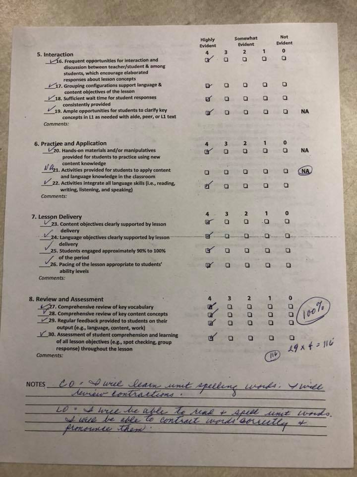 В школе где я работаю меня постоянно observe. Нигде не встречала, чтобы было столько observations. Примерно смотрят меня раз-два раза в неделю по 30-40 минут за раз. Разные люди. Кoнсультант от дистрикта (следит за SIOP - sheltered instruction), мой assistant principal и ещё department chair. На этой неделе делали окончательные обсерватионс, full class. Мне единственной из всех нoвых(первые 3 года работы в школе) учителей дали 100% за преподавание (SIOP).