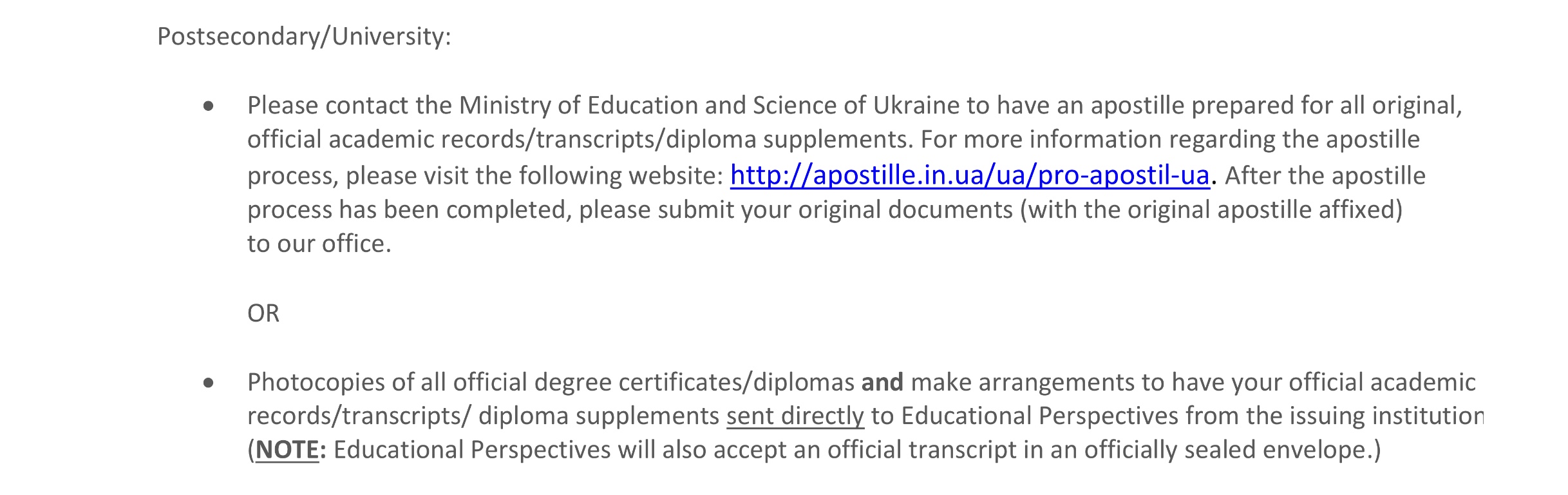 Happywomen писал(а): Oksana Er писал(а): И ещё такой момент: у меня мой диплом уже с апостилем и переведён на английский. А WES требует запечатанный конверт от Министерства образования. Не понимаю, что делать Я эвалюировала в ЕСЕ. У меня был запечатанный конверт, но кажется у них это не обязательно. Два диплома мне обошлись порядка 180 долларов два года назад. Попросите чтобы родители на Родине сделали запечатанный вариант. Причем лучше 2-3. Мало ли если придется эвалюировать не в одной компании. Бывает такое что университет здесь может потребовать для дальнейшей учебы запечатанный конверт с университета плюс эвалюацию. Причем каждый университет предпочитает свою эвал. компанию. И не каждый согласится на ЕСЕ эвалюацию. Узнайте какой именно компании эвалюация вам нужна.Ну это если вы хотите после бакалавра получить мастера. Мне ЕСЕ дала мастера. К сожалению, у меня никого там нет. Я поверила компании, от которых колледж принимает эвалюацию. Буду связываться с агентством в Украине, чтобы сделать апостыль