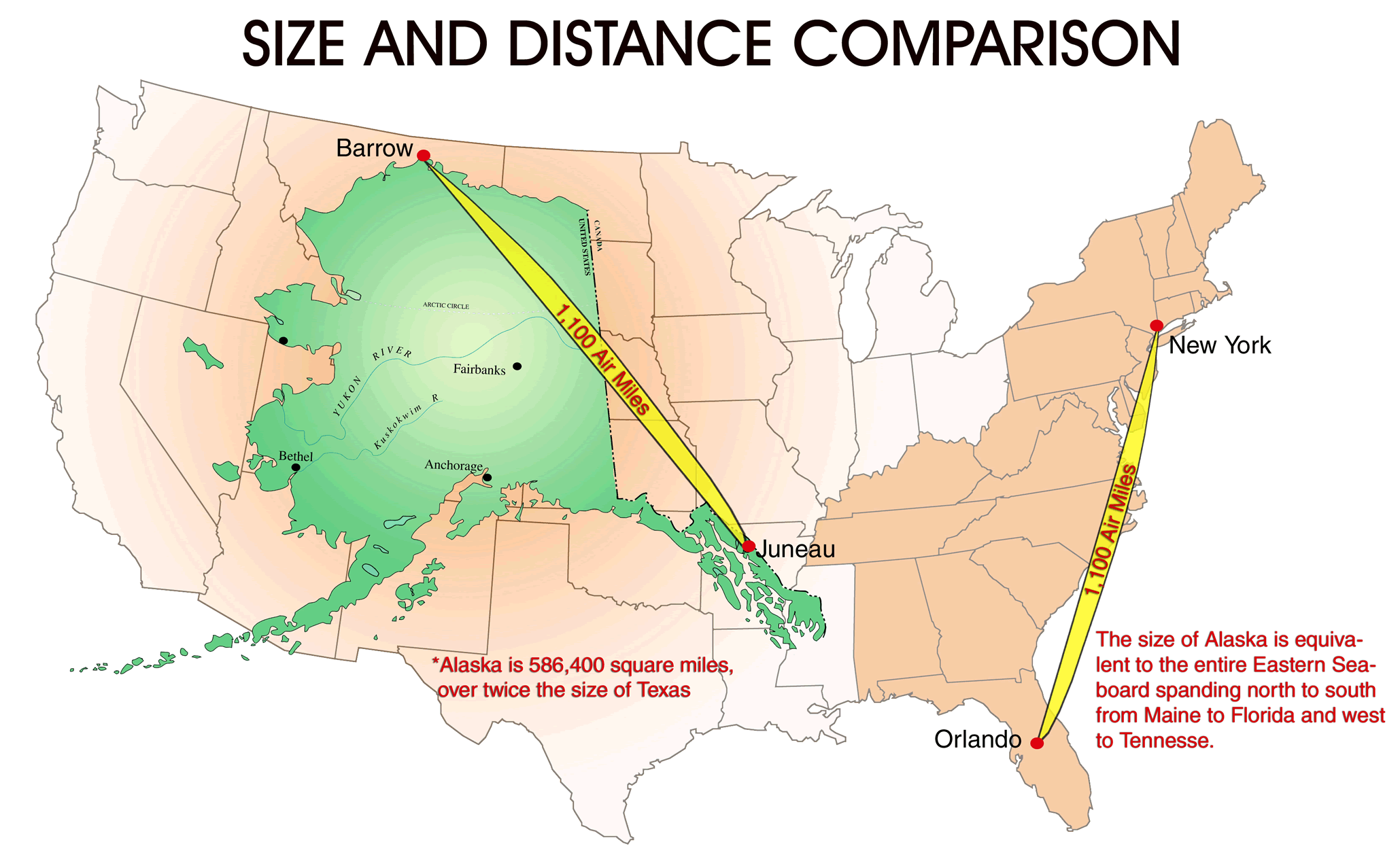Фото для сранения величин Аляски. Заметила, что народ совсем не представляет насколько велика Аляска, поэтому когда спрашивают что-то о Ситке, ну никак не могут въехать, почему это я из центральной Аляски понятия не имею что там в Ситке делается, не могут представить как это далеко. Или почему мне сложно побывать в Анкоридже например, чтобы встретить кого-то с самолета :-).