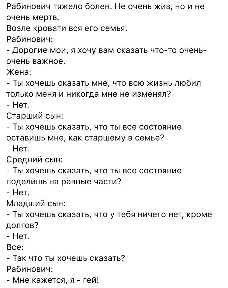 hiclass писал(а): Я не догоняю анекдот. Объясни? Ёпрст! Что ж тут непонятного! Самое важное, что человек может сказать перед смертью.  Мамзелька  Редко доводится видеть смешеые анекдоты, которые я еще не знаю.