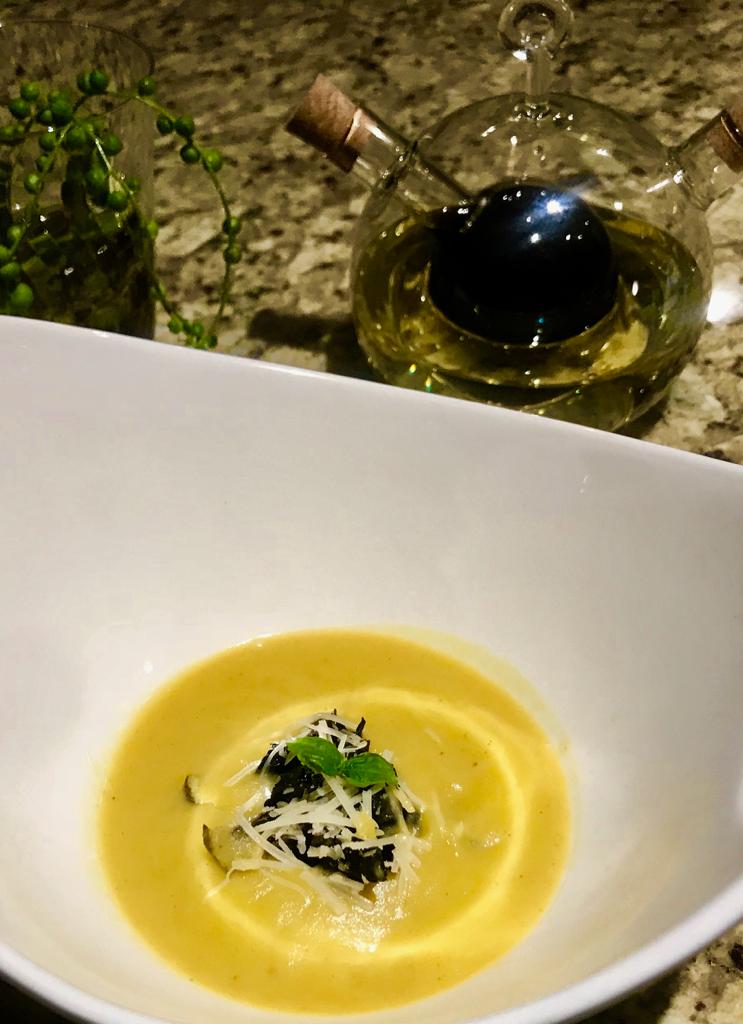 Типа такого. Я уже сама упростила все и делаю примерно. Бери маленькую тыкву или четверть большой, если маленькая то напополам разрежь положи мордой вниз на фольгу и запеки минут 40 400 градусов. Выскреби все - тыква от корки отваливается хорошо - в блендер загрузи бульоном залей и размочаль. Порей зеленую часть не используй а то цвет супа будет как кто то обделалася пардон. Обжарь на масле оливковом залей бульоном куриным и немного повари. Тоже в блендер вылей. Бульоном густоту сама отрегулируешь. Все это в кастрюлю перелей и добавь чесночную соль и я кладу кайенский перец но с ним аккуратно он острый, немного пудры чили. Сама смотри какие специи. Ну соль тоже по вкусу.