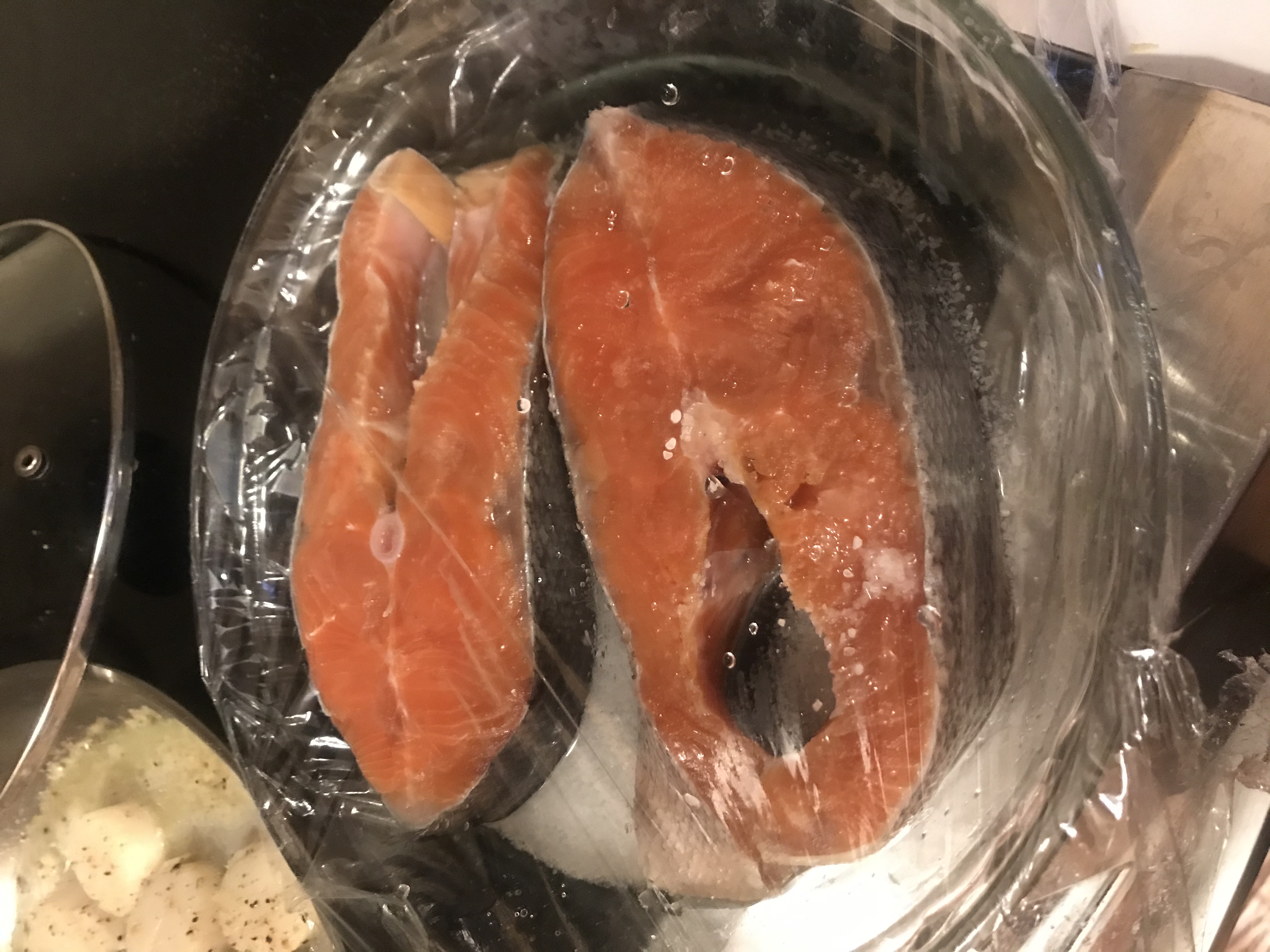 Удовольствия для всех возрастов рыба! Впервые приготовила скалопсы сама, до сего дня мне их готовил муж.Сегодня он только рядом стоял и следил за мной  . Главное, не передержать. Получилось хорошо. Чилийский сибас - неплохая рыба, но до черноморской камбалы не дотягивает. Эх! Стейки салмона готовы, сняла с соли сегодня. Ну и замариновала щупальцы в лимонном соке и оливковом масле +соль. Завтра муж заргилит это дело. Дома не делали, завтра попробуем че получится.