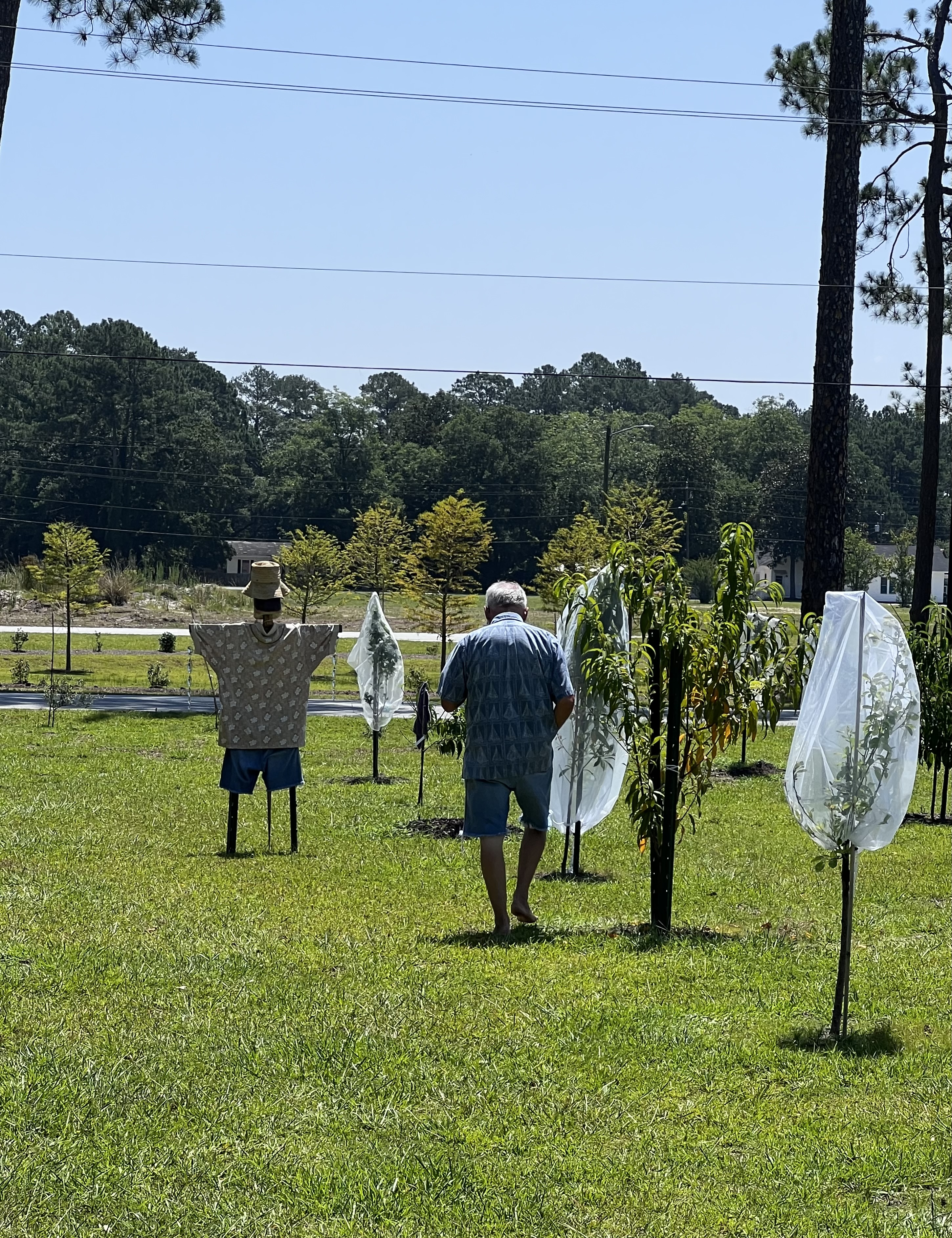 В дополнение к чучелу еще купили сетки, надели на молодые персики и мюлберри.