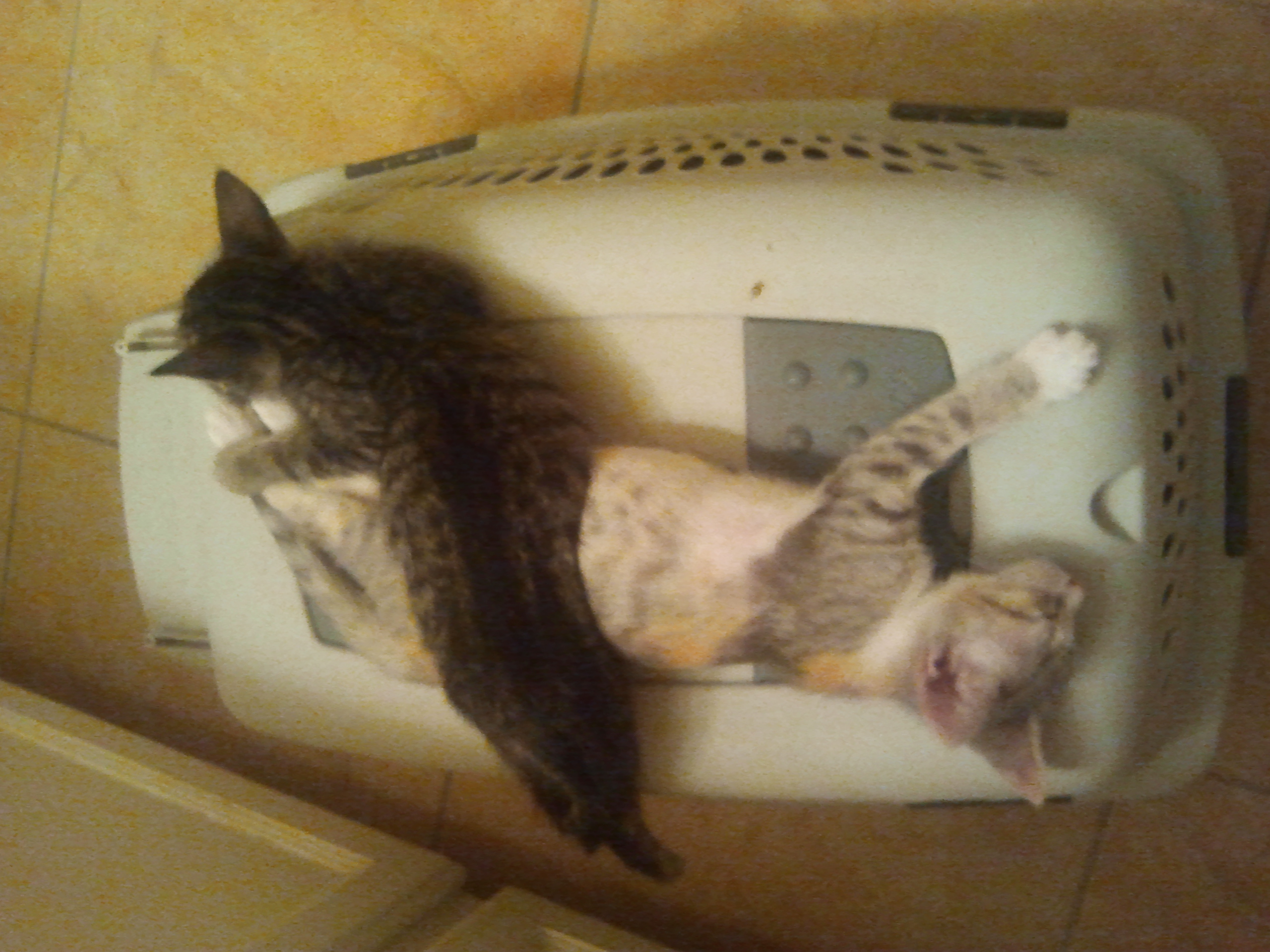 Уже пристроила. Двое было. На фейсбуке пиарила, по знакомым звонила и текстила, всем подряд. Когда клянчишь не для себя - оно не стыдно.  Вот они. Я первое время их в своей ванной держала, а они и не рвались никуда, обнимутся и спят. И лежбище им мяконькое выделила, и по углам полотенчики постелила, и внутри в переноске мягко было, нет - они сверху на пластиковой переноске спят. Трёхцветнуюю девочку быстро пристроила, через 2 недели, она красивенькая была, с белой грудкой, в белых носочках, а мальчик обычной внешности - подольше задержался. Когда девочку отдали, он всё плакал. Тогда стали его выпускать. А до этого боялись, у меня взрослые кошки и чёт они неприветливые выросли