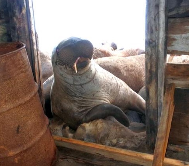 Рассказывает Евгений Басов: А утром мы оказались в осаде. "В осаде" - не фигура речи, всё пространство вокруг домика было заполнено моржами. Мы оказались в самом эпицентре моржового лежбища. Промысловая охотничья изба была построена давно. В те, советские времена моржи выходили в стороне от жилья и не в таком количестве.