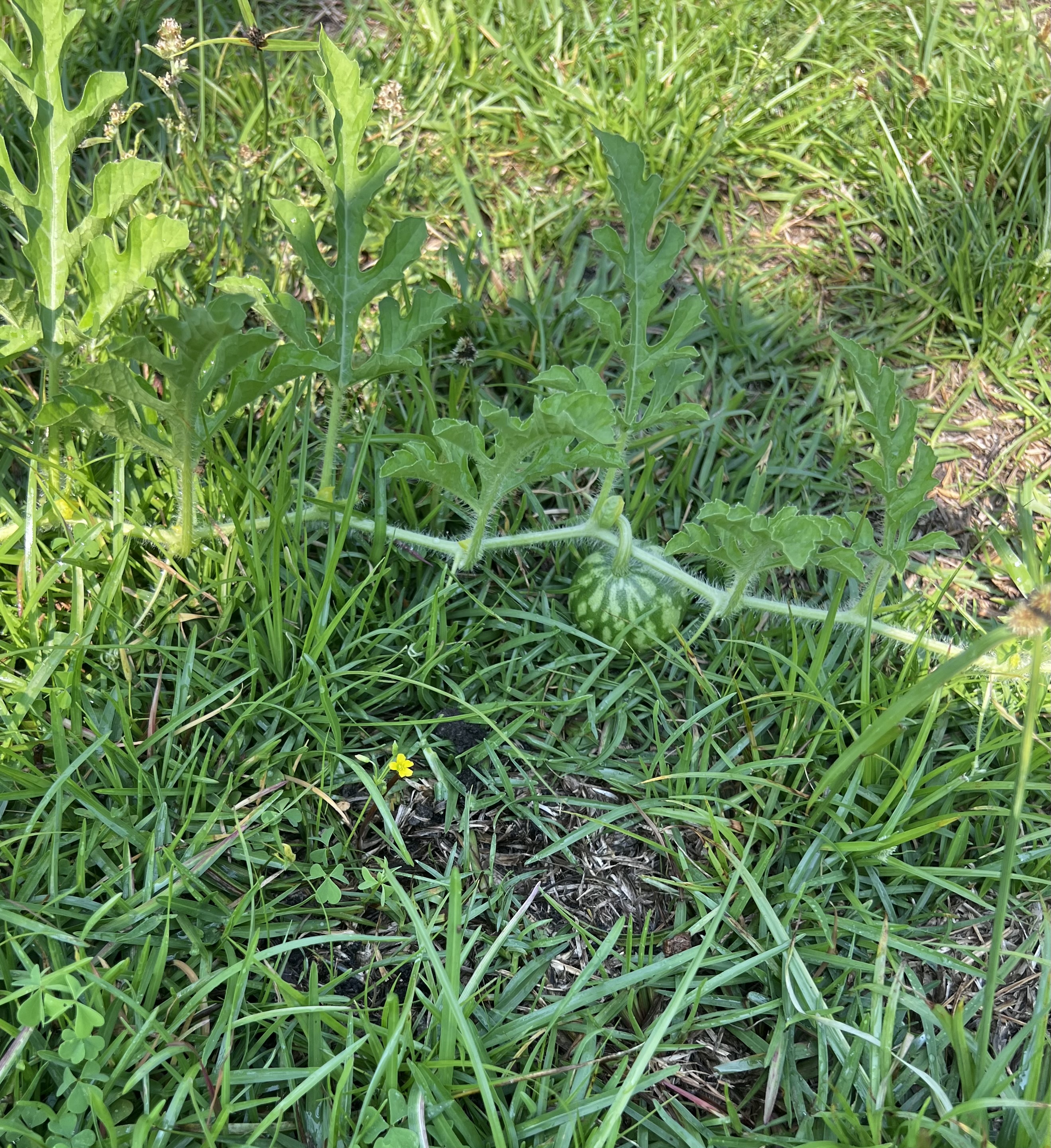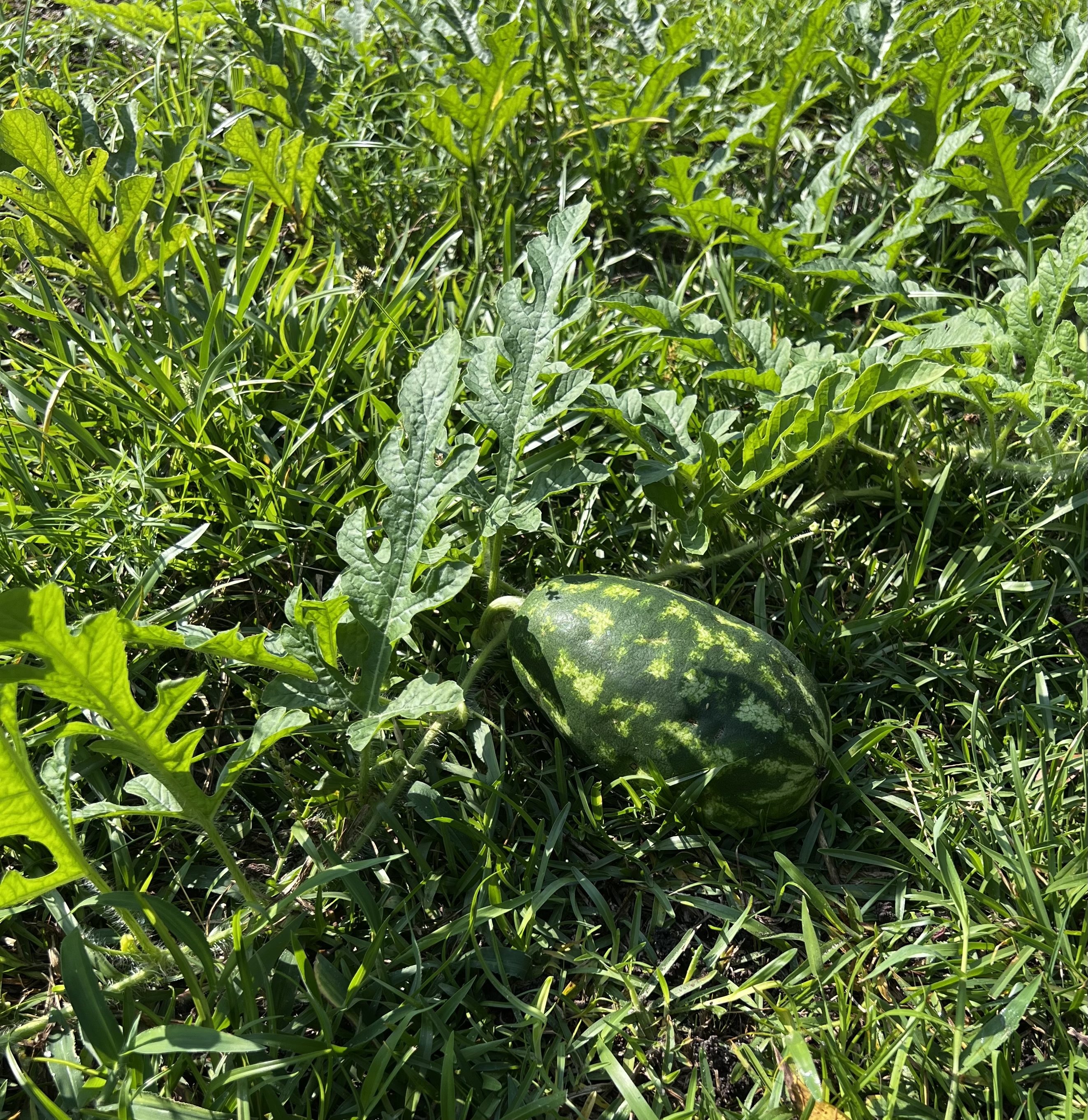 Семечки начали чернеть, они с белыми прожилками, как и сажала. Мелкие арбузики в траве.