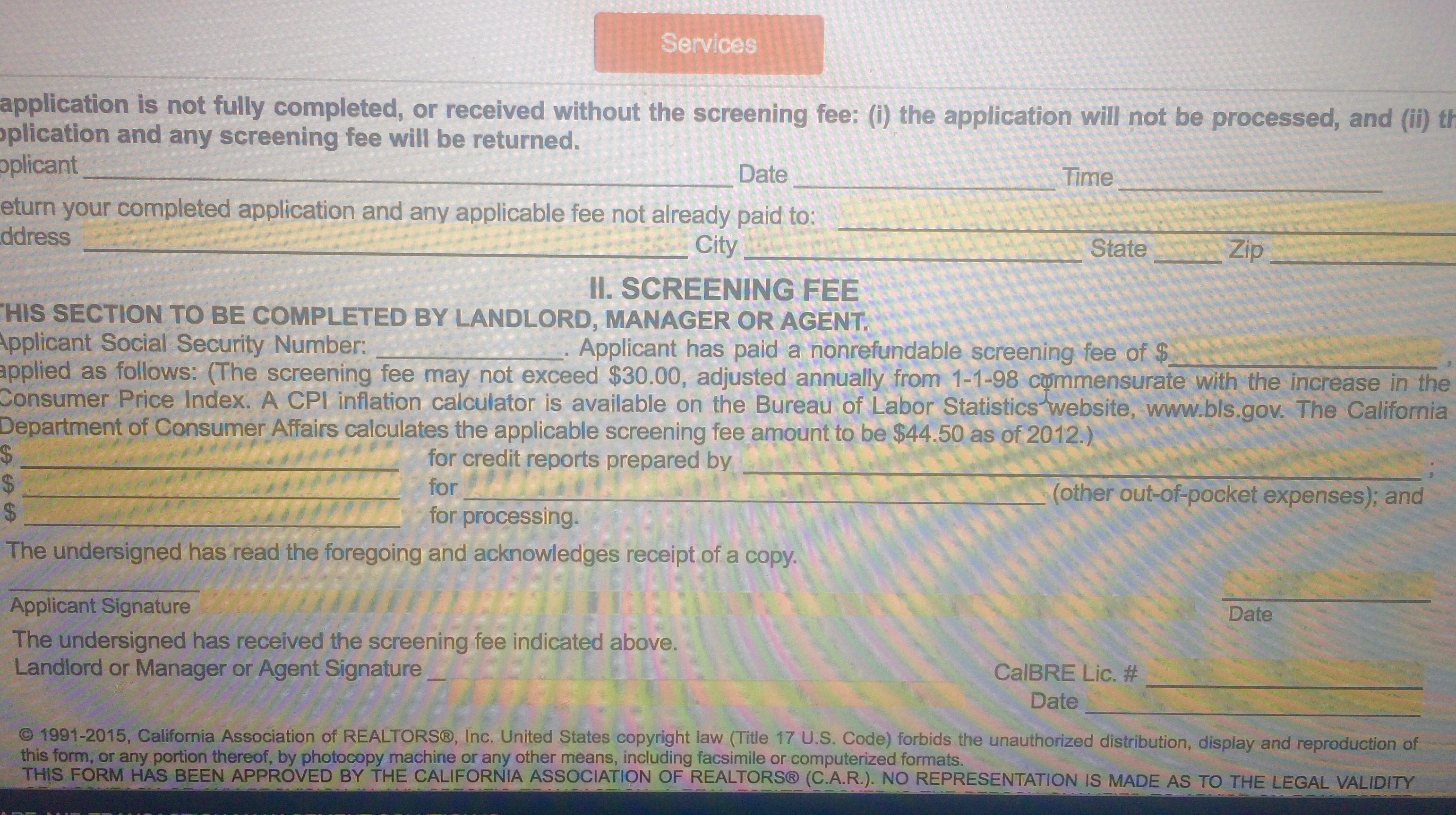 Скринят кредит хистори, только с разрешения потенциального тенанта и согласия оплатить скрининг. Вот один из видов аппликейшена - эта стандартная, которая с California Association of Realtors. Они могут использовать свою, но которая не в конфикте с законами СА и федеральными законами. Аппликейшен фииз обычно чарджат скриинг компании $30-45
