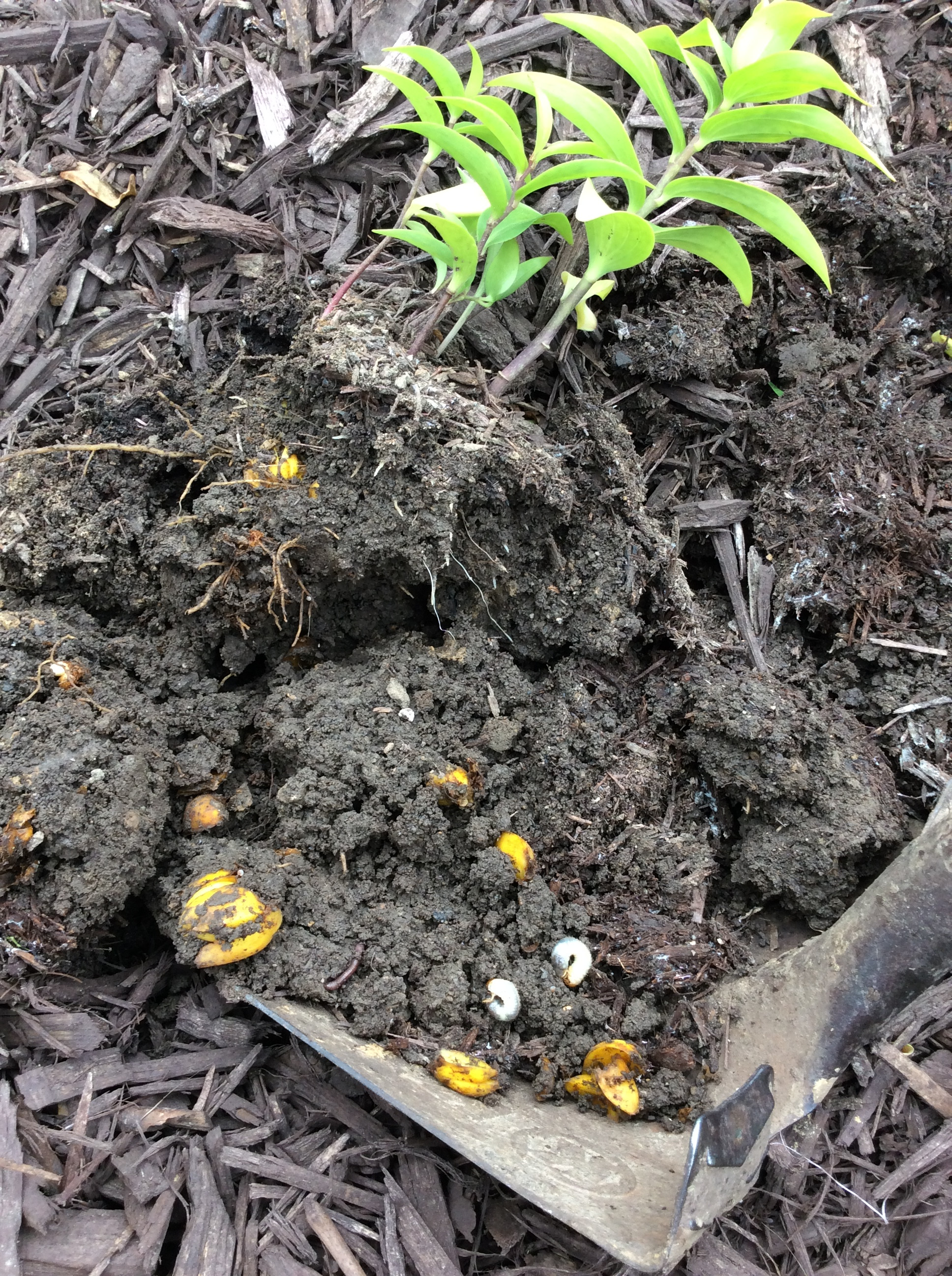 Про розы, я в eden тоже влюблена, уже второй год хочу, видела фото на паре блогов с нашего юговостока, такая красота. Планировала посадить в этом году, но не получилось. Но уже наверное поздно, да и распродана она везде на знакомых мне сайтах, по крайней мере неделю назад не было, я в итоге закупилась всякими редких расцветок калладиумами и лилиями, и еще решила попробовать висячие двойные бегонии. У кого такие есть? Что от них ожидать? Ну вот, у нас тут страда полным ходом, а она там обои клеит Волжская, я сегодня в саду копошилась, пересаживала свои хунькие лилии в хорошую землю. Пикчу для тебя сделала. Погляди, кто жрёт наши луковицы. Личинки Japanise beatles. Или grabs. Видишь уже одну луковицу сожрали - распалась. Я их уже не первый раз на месте преступления ловлю Сегодня заодно раскидала везде Grab`s control сухой порошок что бы убить этих гадов.