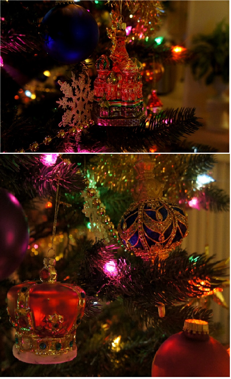 Одна из моих любимых тем Обожаю это время года!!! У нас елка очень высокая, упирается в потолок. И с разноцветными лампочками, поэтому украшения тоже "разношерстные". Помню, пару лет назад в Мейсис продавали игрушки с русской тематикой. Я тогда только нашла нашего Деда Мороза, Снеговичка, Кремль, шапку-мономаха. Видимо Снегурка раньше разошлась... Сейчас муж в командировке, младшенькая нудит, что у всех уже все украшено. Сама не осилю, и я решила прикупить елку по-меньше. Сегодня пол-дня моталась за ней и игрушками, к вечеру с ней нарядили. Решили сделать в девчачье-золотистом цвете.