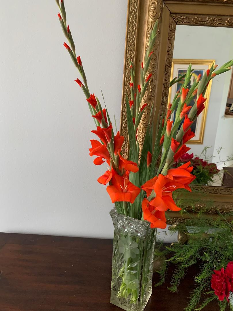 Оклахома, ну ты-настоящий биолог!!! А у меня гладиолусы зацвели, которые мелкие, забыла, как называются. Эти я поздно посадила,в конце мая. Заказала микс, пока вижу, только один цвет...  Большие луковицы чего-то задурили, некоторые явно погибли, и пока цветоносов нет. Посажены в разных местах...Но, так как с огруцами меня - никак, решила буду цветов на срезку больше сажать. Даже розочки с давнишней "розовой" лихорадки еще все не погибли. На улице жара , я сразу среазаю и в дом. Все время свежие цветы дома.