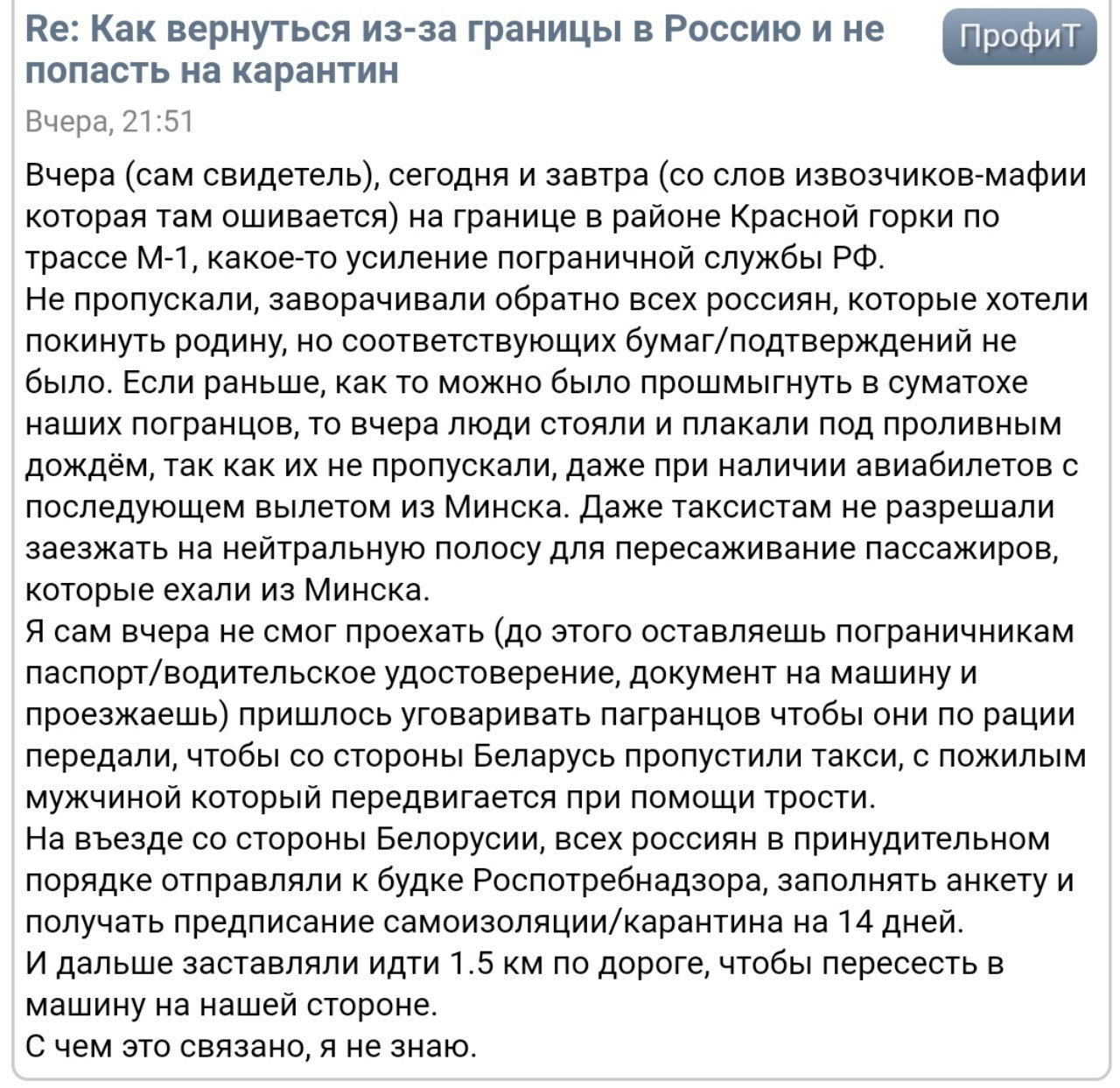 Betty123 писал(а): sweetalla писал(а): Betty123 писал(а): В телеграмме есть группы кто через Минск летит в Россию и из России через Минск. Почитала. Кому надо могу скинуть в личку. Там инфа как найти перевозчика из Минска, автобусы, что проверяют что не проверяют. В Россию лететь это ну очень надо хотеть - приключения ещё те. Мало кто верит что пустят самолёты. Люди по 6 раз покупали билеты Если я правильно понимаю этот трик с Беларусью можно проделать только если есть российский паспорт? Там можно вопрос задать. То что я читала там сборная солянка - есть кто летит из США . Читаю что летят полные самолёты в Минск. Нашла ...пишут что пересекают границу по российскому паспорту. Не показывают что из за границы прилетели. В том то и дело. У меня нет российского паспорта, только американский. Так что этот путь тоже закрыт.