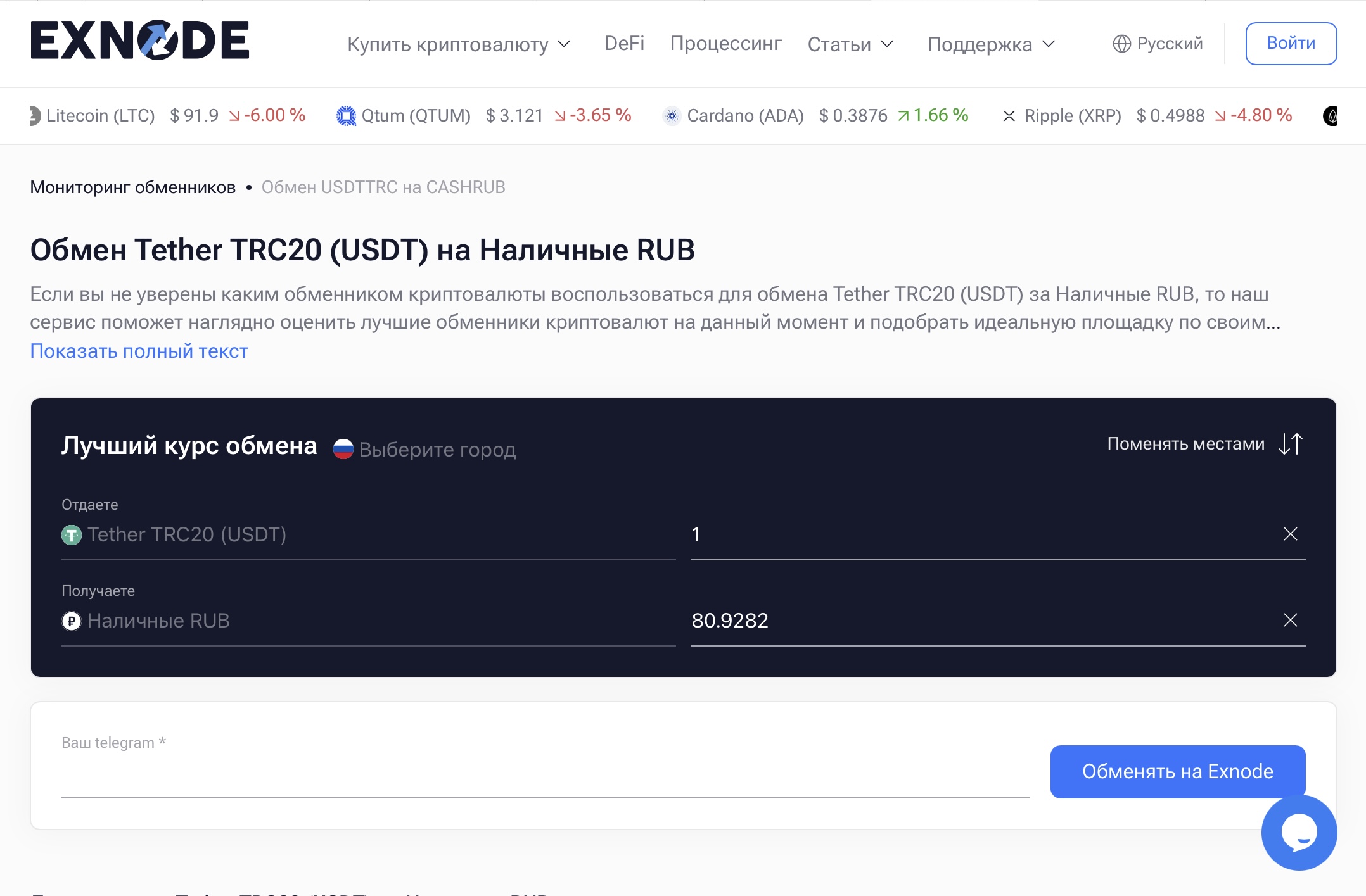 Вот этот крипто обменник тоже предлагает обмен на наличные; при этом курс на обмен налом выше намного, чем перевод рублей на карту МИР