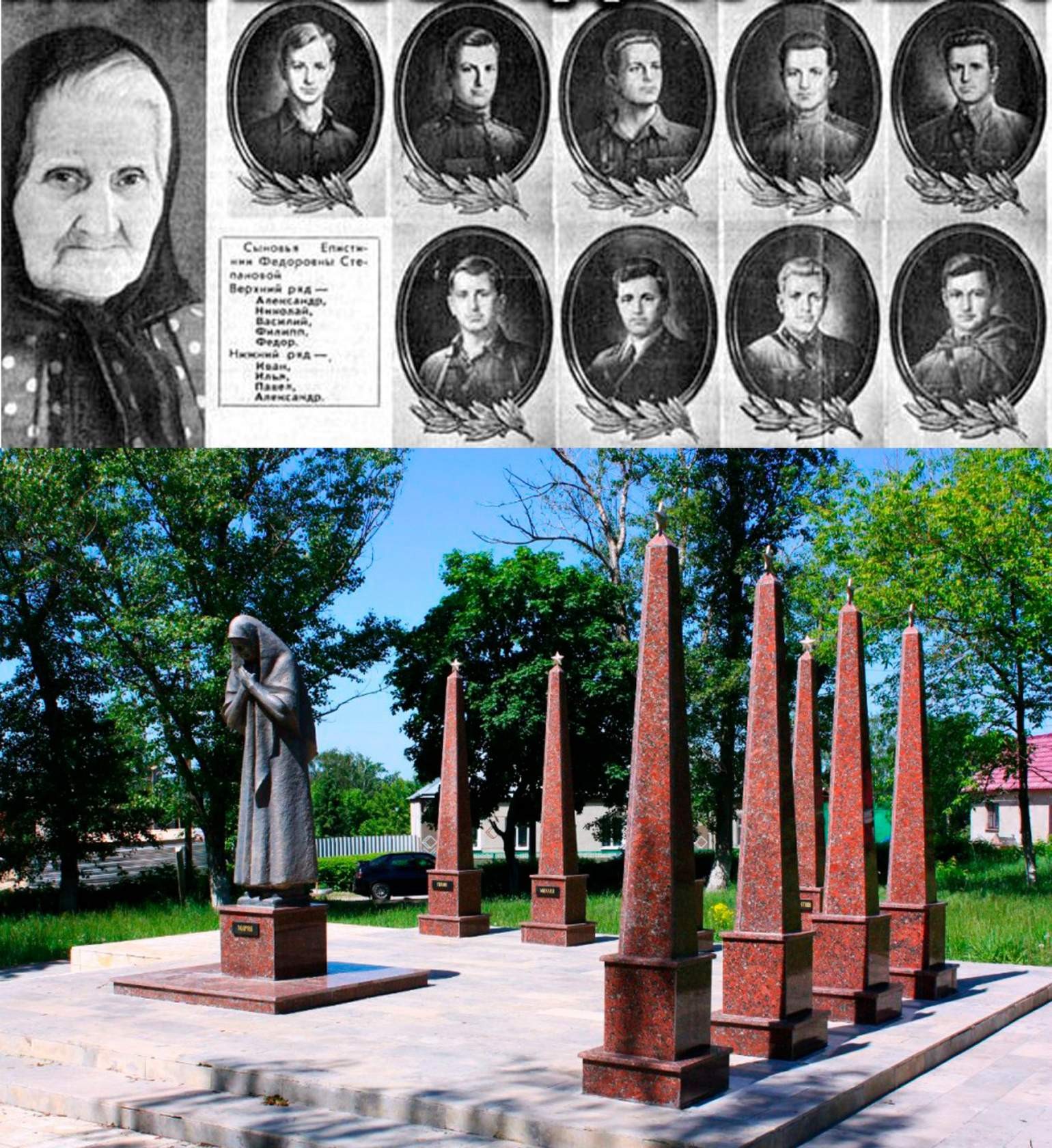 У его основания всегда лежат цветы. В отличии от многих других абстрактных монументов, не имеющих под собой никакой реальной и берущей за душу истории, у памятника из г.Задонска Липецкой области такая история есть. Это вечная история материнского и ратного подвига, которая никого не может оставить равнодушным, сколько бы времени не прошло с весны 1945 года. История этой семьи настолько берёт за душу, что отнестись к ней равнодушно-снисходительно может только чёрствый человек, подобный пустому сосуду: вроде и ёмкость есть, а содержания нет.