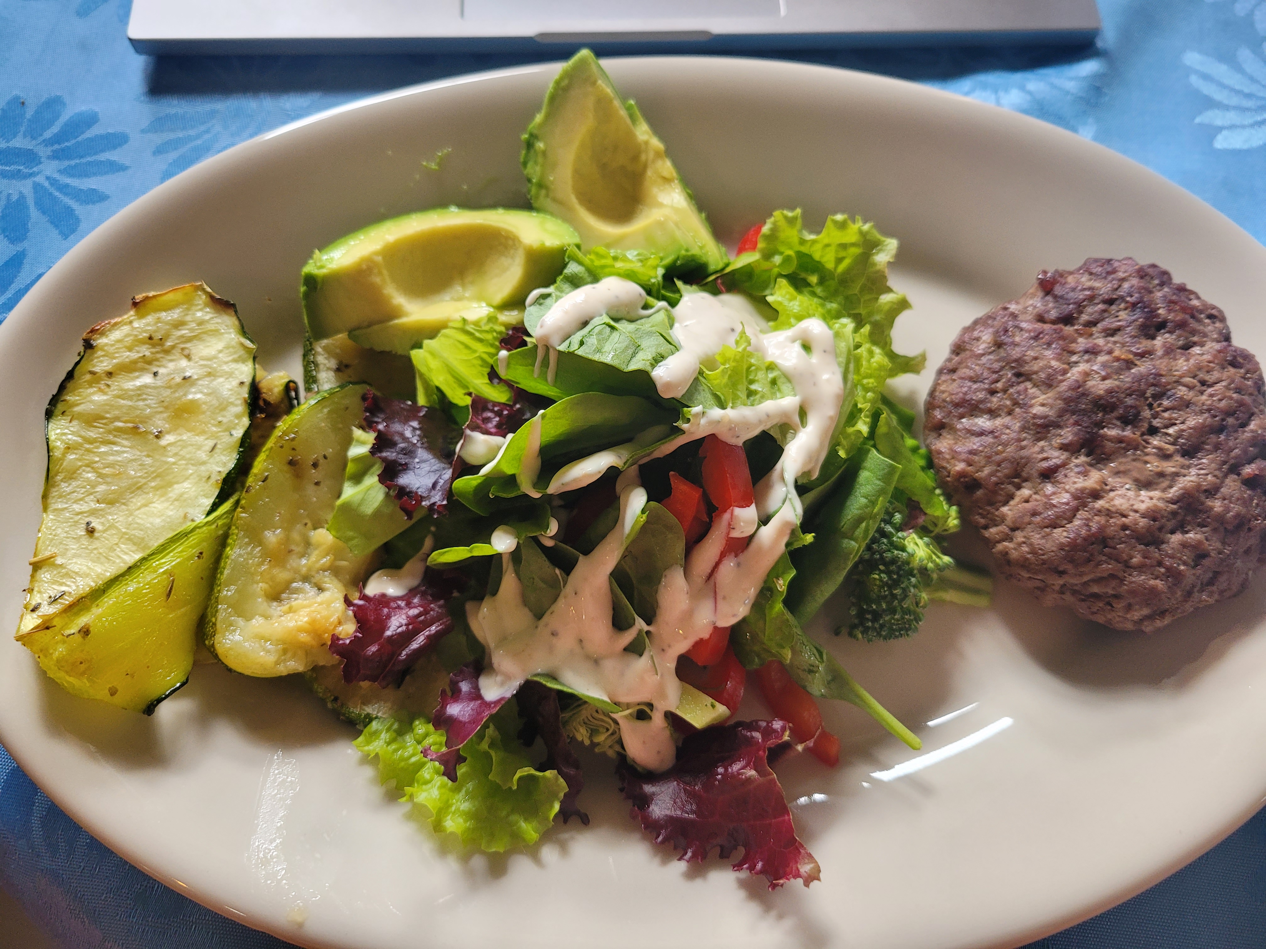 Хвастаюсь. Запекла в бройлере кабачок (свой!) и котлету из лося. В салате свой летус. Праздник пришёл и на мою улицу! А то смотрела на ваши урожаи и завидовала.