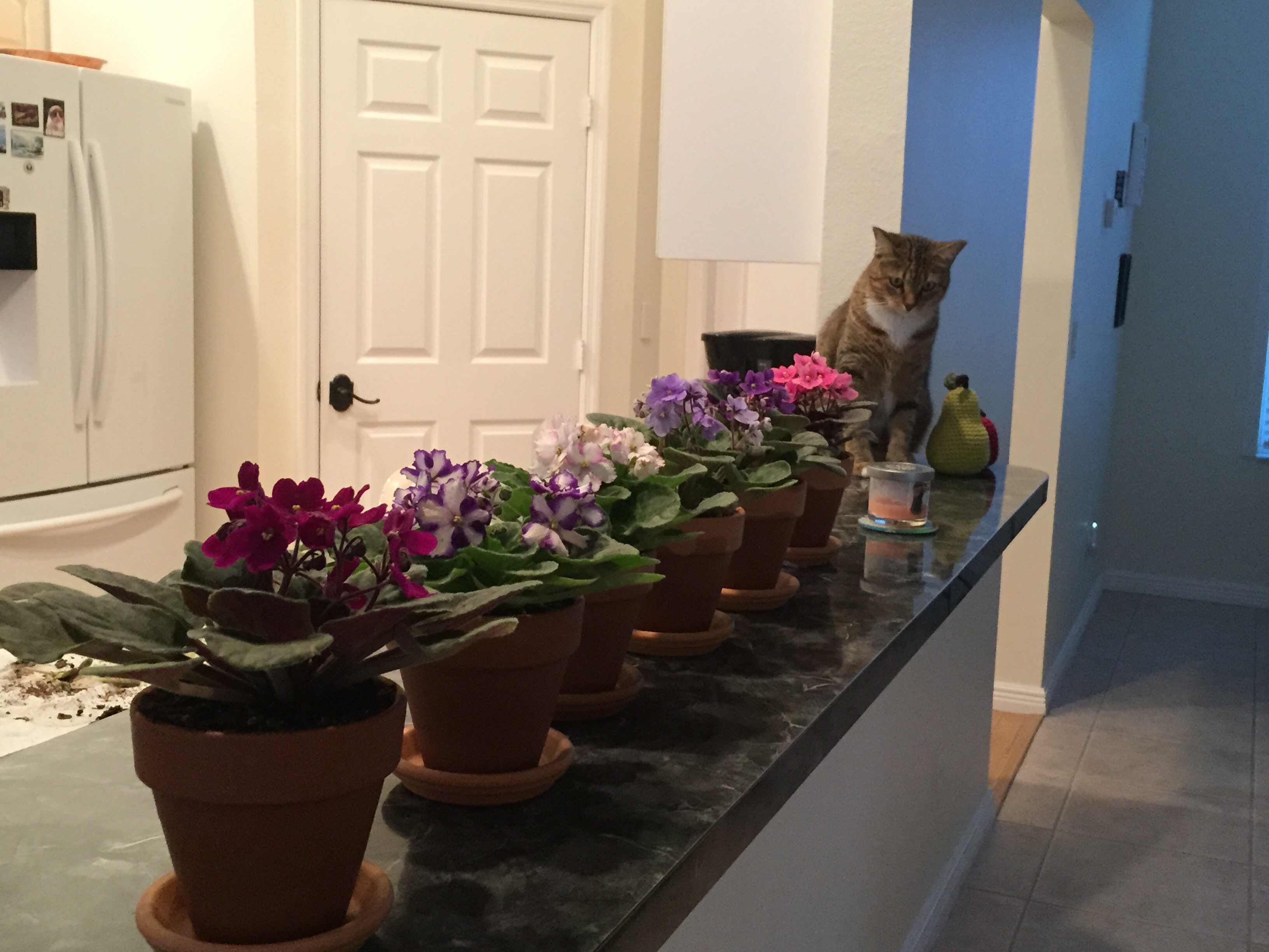 Crystal что это мой кот у вас в ванной делает? ))) С фиалками фотка забавная - у кота рожица смешная - сидит и не понимает, где ему гулять-то теперь? Совсем места не оставили  [/quote] Да у нас 2 кота Цезарь недавно усыновленный - черный, какая то помесь с сиамцем И Клеопатра в полосочку, ее из Фениксе мы привезли, обы грызут все растения, так что я только не токсичное покупаю.