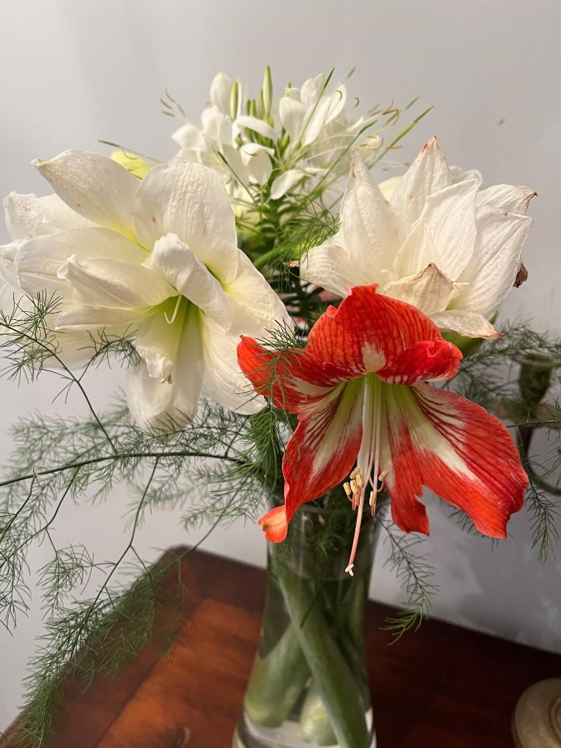 Кстати, хорошая идея, мини-розочки в землю попробовать. У меня одна дрифт, безпроблемная. Остальные все закочевряжились. Уж наудобряла , еле цветут...  Обычно ,хотя бы в первое цветение приличные цветки, а сейчас ,как засохшие сразу . Зато дей лилии прут, разрастаются. Ладно, что-то цветет, и на том спасибо! Наконец-то белые амарилисы зацвели, я уж думала пропали. Надеюсь, будут тоже размножаться, как красно-белые.  Срезала,а то дожь идет, они к земле начали клониться.