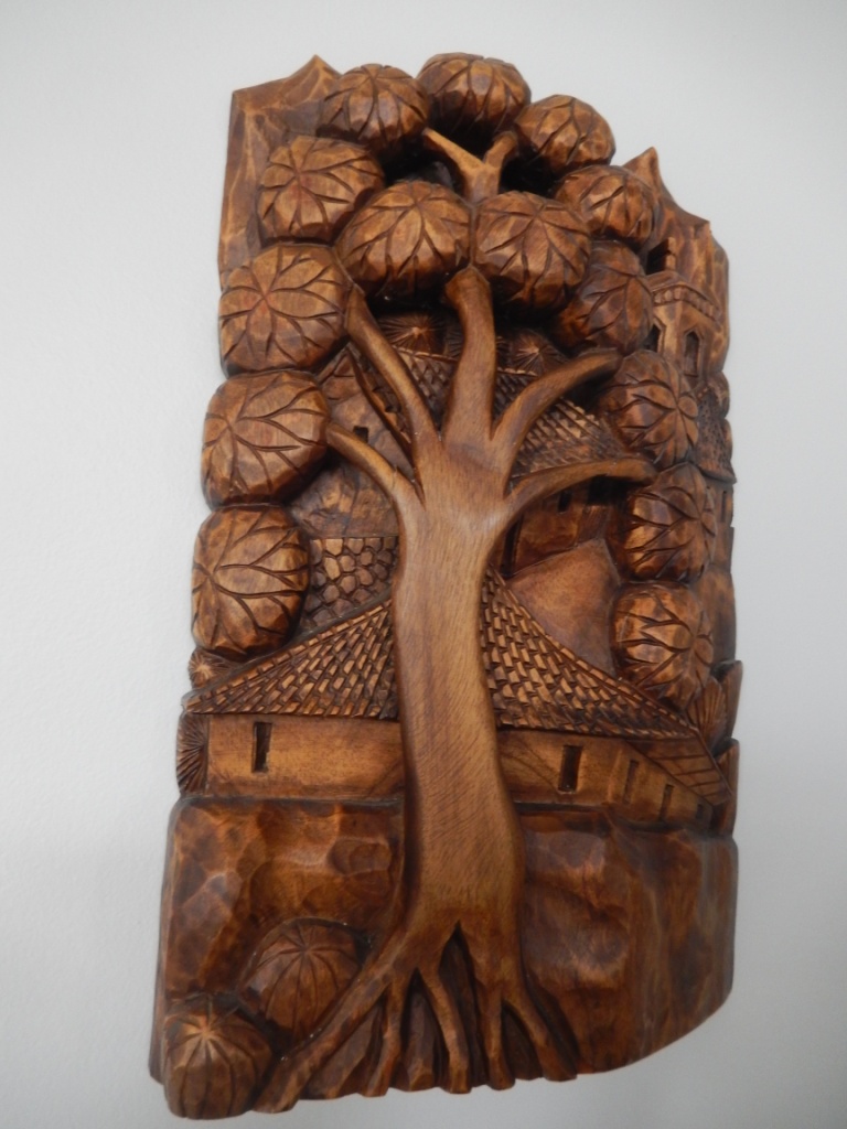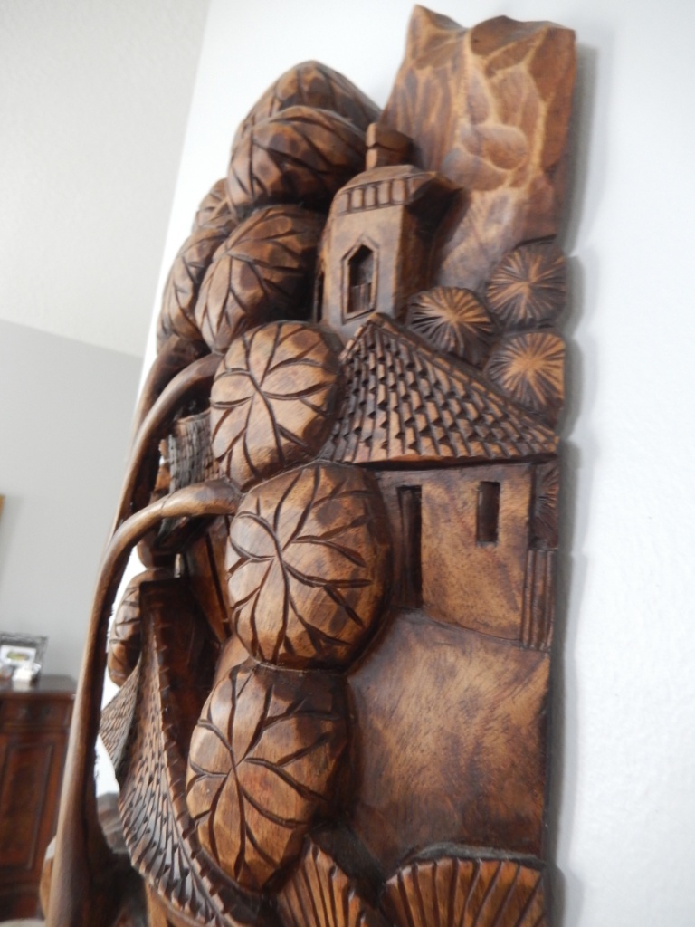 Стены украшаю тем, что вызывает какие-то чувства-воспоминания.  Фотографии личные не люблю вешать, ставить. Так как у нас были лошади и я их очень полюбила присутствует "лошадиная" тема. Картину-пейзаж, довольно известного российского художника,очень люблю. Только вот рамку надо подобрать. Деревянная картина, из Коста Рики. Она, как 3 Д.Очень интересно вырезана изнутри.