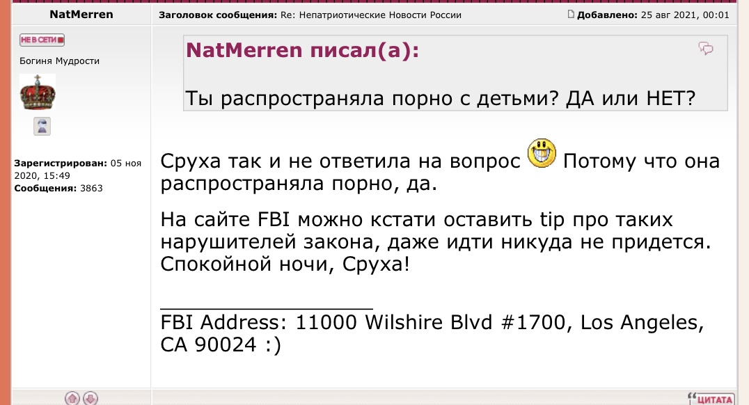 Модераторы, НатМеррен продолжает распространять враньё про Ник Вилоресси о том,что та якобы рассылала порнографию (нонсенс)