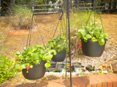 Помидоры и клубника в воздухе висят. Есть еще помидоры на грядочке, которые я вырастила из своих семян. Там они как лошади стоят - все в цветках. На фото они плохо выходят, рядом большое дерево, за ним я грядку и спрятала.