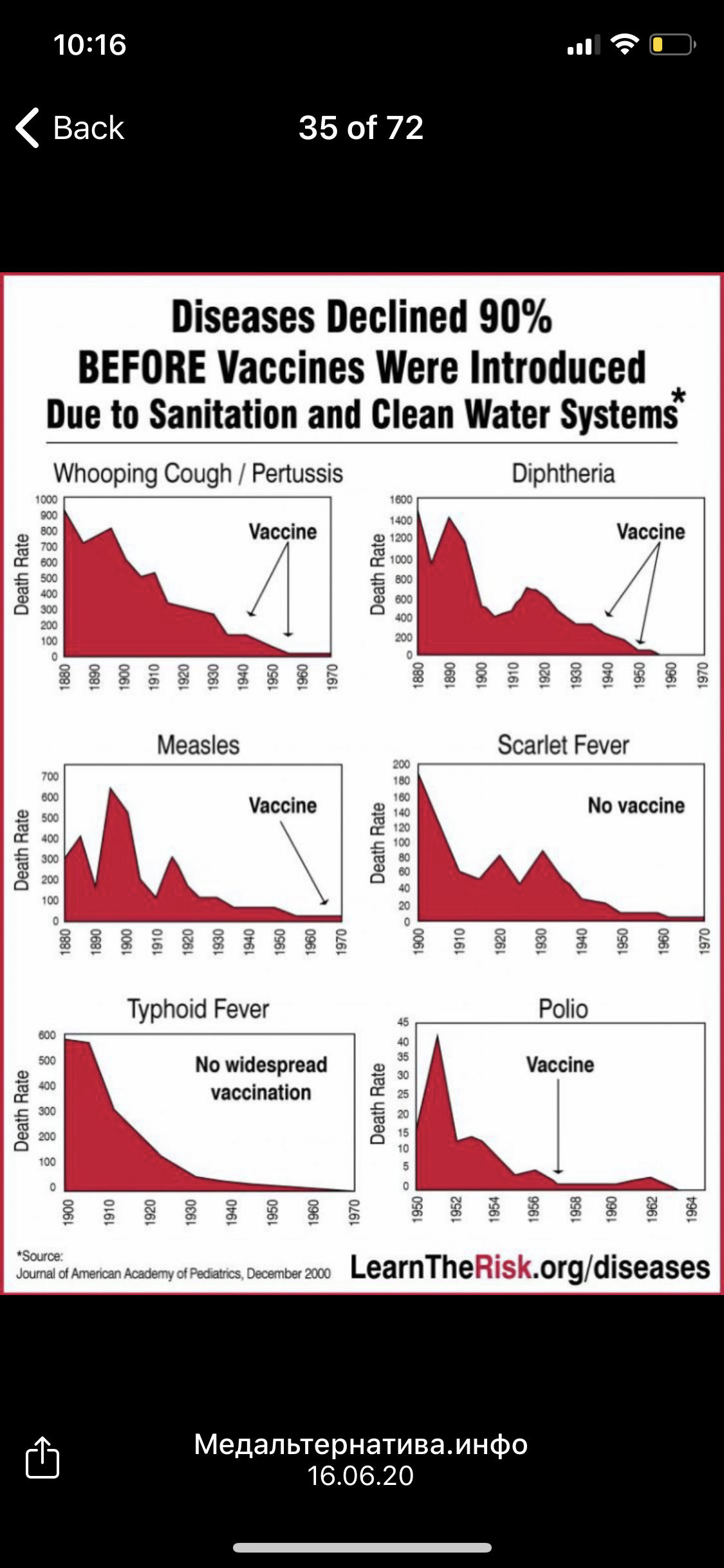 Zoila Lewis писал(а): Amalia_Ca писал(а): sweetalla писал(а): Амалия, что с тобой происходит? Психоз какой то. Я уже довольно долгое время наблюдаю за твоими сообщениями. тебе просто повезло, что тебя и твоих близких не коснулась эта беда. И мне не интересны твои многочисленные интернетные вырезки или примеры многочисленных подруг. Мой дядя и его жена на данный момент в тяжелейшем состоянии. Они сотни раз за свою жизнь болели гриппами , орви и тп... ничего общего и подобного, что происходит сейчас. Сочувствую что болеют твои близкие . Желаю скорейшего выздоровления . Но ... я не поддерживаю сегодняшнюю панику , диктатуру , закрытие границ, контроль передвижения , тестирование и прочее . Очень жаль что тебе не интересны ссылки , в панике и страхе люди потеряли способность к объективной оценке / мышлению . Я скинула не мало информации мнения профессоров , докторов наук и прочих врачей , о тестах , и вообще о вирусе в целом. Но кому то я думаю будет это интересно . 1 из 100 и отлично . Ничего личного. Никогда не была грамма наци. Но может это описка. Очень надеюсь. Но не грамотному человеку веры нет. А вот в доказательную медицину - есть. Она людям жизни спасает. И много жизней. Иначе где бы мы были сегодня без медицинского прогресса и без тех же самых прививок. Почему вы так решили ??? Единственная прививка которую отменили за все время , это прививка от оспы , разве оспа вернулась ? А вы знаете что смертность от большинства болезней была почти на нуле ещё до применения прививок повсеместно ? Вы изучали эту тему ? скину графики как пример , это официальная информация , просто многие не считают нужным гуглить и задавать вопросы на эту тему . Зачем ? Ведь там и так все ясно ( ну якобы ясно ) . Почитайте книгу она написана врачем , после работы 14 лет в больнице она заметила ухудшения пациентов после прививки . Она решила их отменить , что бы посмотреть показалось ли ей , или действительно это связано с прививками или совпадение , Выяснила что с прививками не все так просто , начиная с истории. Она нарвалась на шквал критики среди коллег и тогда она начала изучать эту тему , написала книгу . Ее стоит почитат независимо за прививки вы или против , это история . И ещё добавлю в своей книге она написала; «Когда я работала в больнице , все 14 лет ко мне не было никаких вопросов к как к специалисту, меня уважали и в моей компетенции не было сомнений, как только я начала изучать тему прививок, и высказывать свои наблюдения , задавать вопросы , коллеги и начальство начали отворачиваться и называть меня мракобесом».