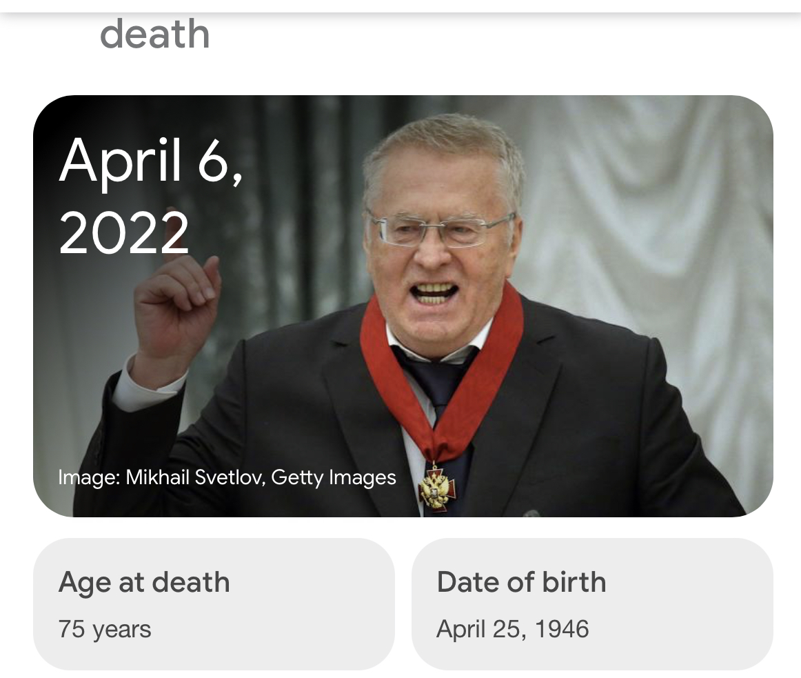 Помнится, когда Жирик был мертв уже почти месяц, спикер госдуры Володин говорил, что вот прям вчера разговаривал с Жириком, который мол лечится от простуды. Так со всеми наверху - пока не поделят место и активы покойного, о смерти не сообщат.