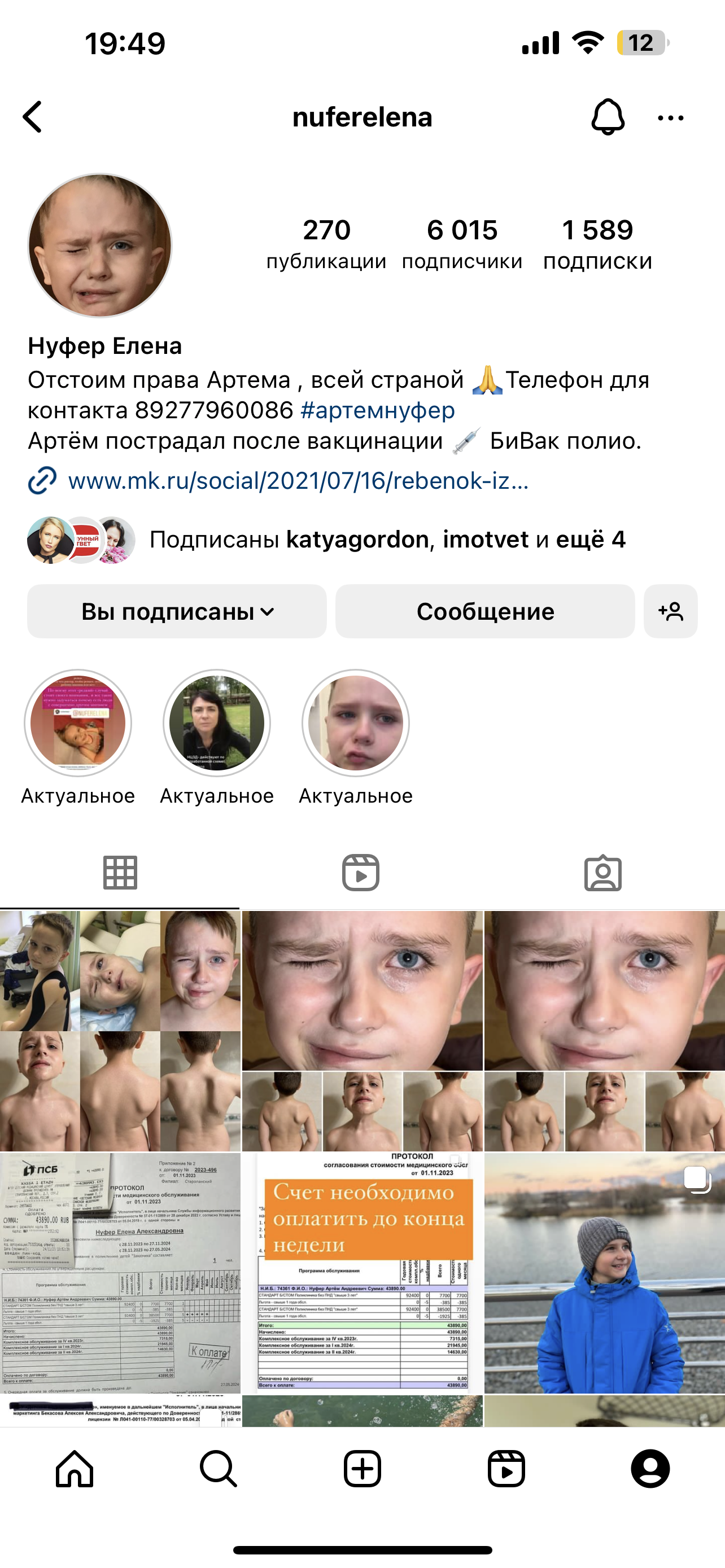 Что за бред что вакцинация вызывает рак? Случайное облучение радиацией вызывает рак, к примеру. Ты читала Веру Городилову , ученая онко-иммунолог. Скину почитай. Спасибо, Амалия, почитаю. Если вам интересно посмотреть как работает бюрократическая система, рекомендую подписаться на Instagram канал Артёма Нуфера. Это самая показательная история. Пять лет назад Артём получил прививку от полиомиелита, и заболел полиомиелитом. Пять лет мама добивается справедливости в судах, и до сих пор не признали поствакцинальное осложнения. Вот их канал.