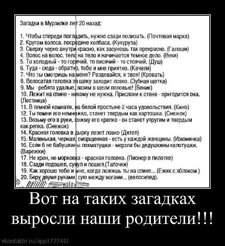 Isolda писал(а): Загадки  Ну, не 20 лет назад, а все 40... А может и вообще не печатали, я лично - не помню. Цитата: По одной версии - в мурзилке их не печатали, и это фейк По другой (неподтвержденной) - публикация имела место примерно в 1974-1976 гг http://lib.ru/ANEKDOTY/zagadki.txt