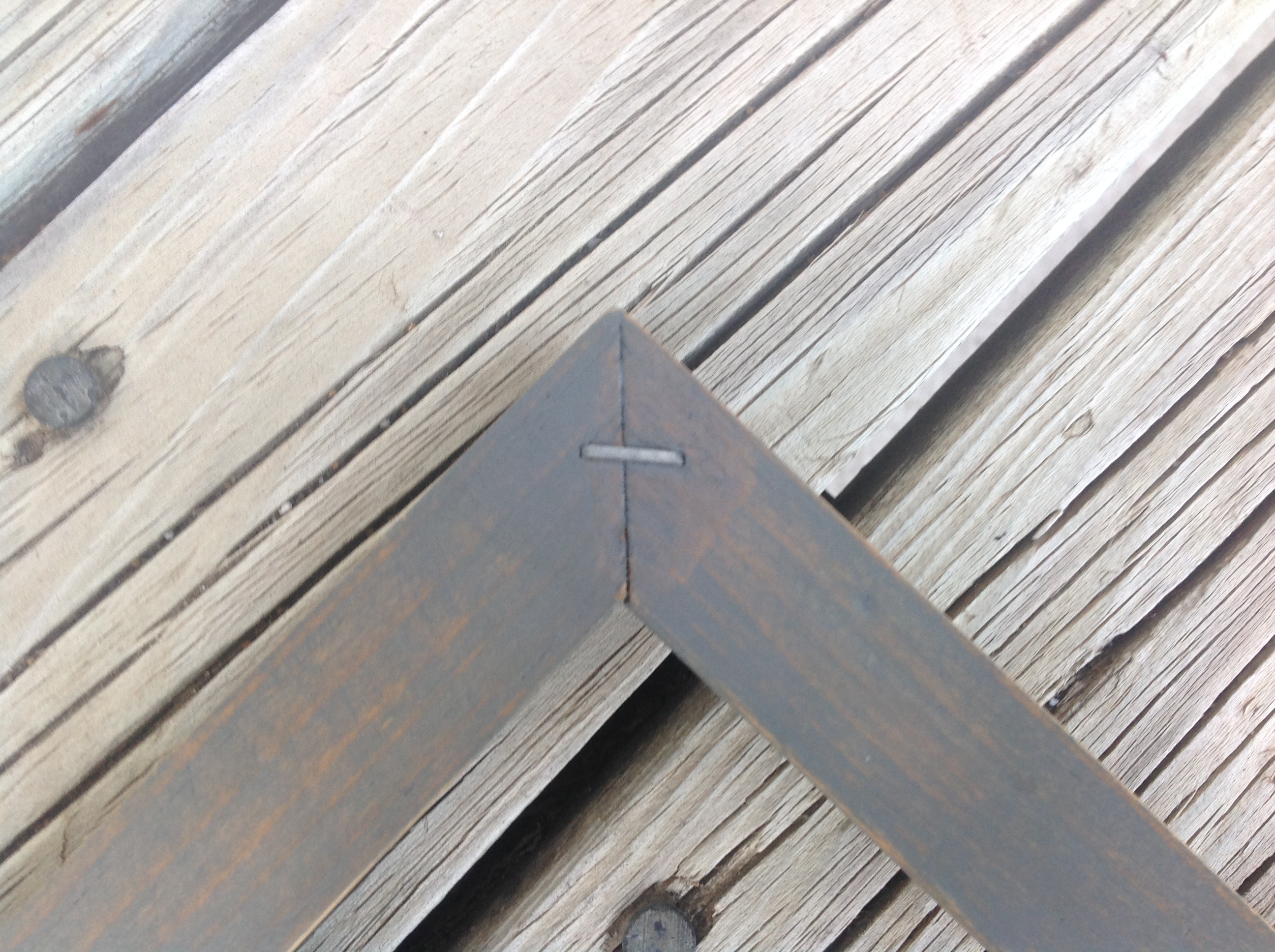 Прямоугольные бруски пилю под 90 град. для изготовления простой рамки. Затем, предварительно загнав гвозди в одну планку, намазываю тонким слоем обе планки в местах соединения клеем для дерева и сколачиваю угол. Можно без клея, но с клеем надёжнее.