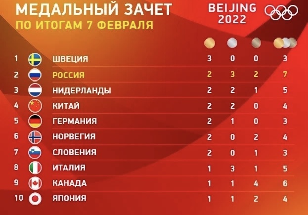 “ Россия занимает пятое место по количеству золотых медалей в общекомандном медальном зачете и первое — по общему количеству медалей — 9 (2 золотые, 4 серебряные и 3 бронзовые).” У нас ещё одна медаль Столько позитива и смотреть -такое удовольствие