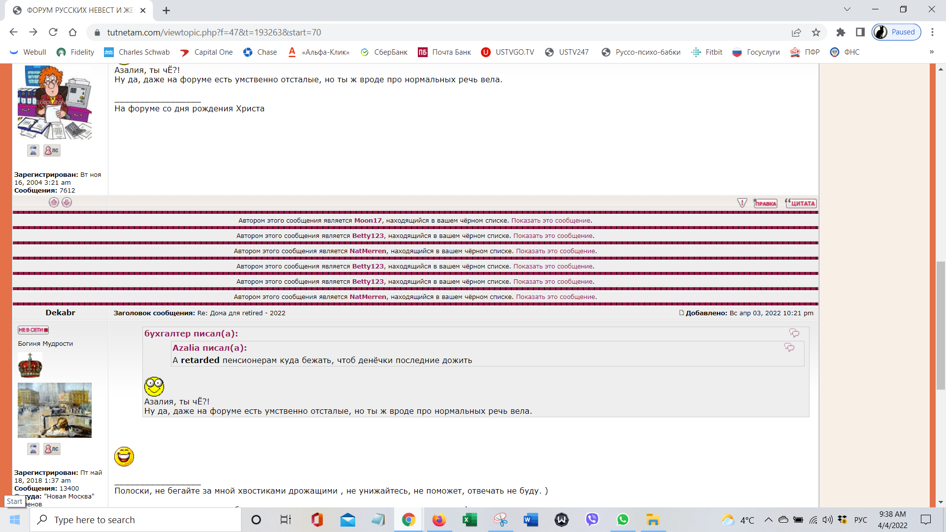 бухгалтер писал(а): Azalia писал(а): А retarded пенсионерам куда бежать, чтоб денёчки последние дожить Азалия, ты чЁ?! Ну да, даже на форуме есть умственно отсталые, но ты ж вроде про нормальных речь вела.
