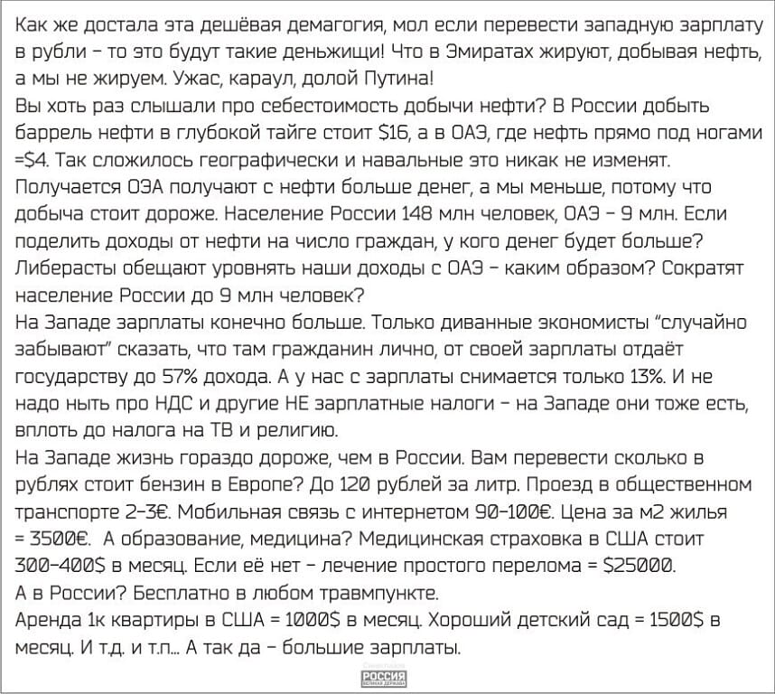 Jaxi писал(а): Алла, умничка!!! Такой замечательный пост!  С Новым Годом и Рождеством!! Амаля, люди, похоже, забыли, как при предыдущих президентах жили. Сейчас ведь небо и земля.И променять пусть далеко не идеальную жизнь на либерастов вообще-то немногие хотят. Но жаловаться ох как любят. А те придут и начнут грабить Россию, как при Ельцине и Горбачеве. Разрушат всю оборону.. Моя знакомая, которая отсюда в Зеленоградск уехала, просто возмущена. Я тоже на их группу подписана,все время народ бухтит и ноет насчет власти. А она говорит, уж насколько придирчивая дама-придраться-то не к чему. Мои все хоть и любят критикануть,а не хотят никаких потрясений. Где она идеальная жизнь.Здесь что ли...  А что не вспомнить татаро монгольское иго? После Горбачева 40 лет прошло!!! За это время другие страны так ускакали что Россия уже не догонит никогда. Было одно десятилетие когда нанефть была высокая цена тогда росли доходы. Зато закончились призывы догнать и перегнать Португалию, построить империю и т.д. все лозунги провалились. Ах да в.о.в. осталась больше ничего. От нефти будут отказываться все больше и больше уж больно она климат поменяла. Я не знаю почему ты так перепугана переменами в России хуже уже точно не будет. Да и кой кому уже скоро 70 и к сожалению он не современен что не допустимо в наше время. Тебе нравиться коррупция и засилье силовиков , оголтелая пропоганда против страны в которой ты живёшь, лживость пропагандистов которые вливают в уши бедного населения ложь а сами скупают дома во вражьих странах. Тебе нравиться все это - вы так любите Россию что хотите чтобы она жила в этом ... и дальше.  чтобы заплаты были ниже плинтуса про пенсии уже не говорю это просто жесть. Пенсионный фонд развлрован - его кстати упразднят.