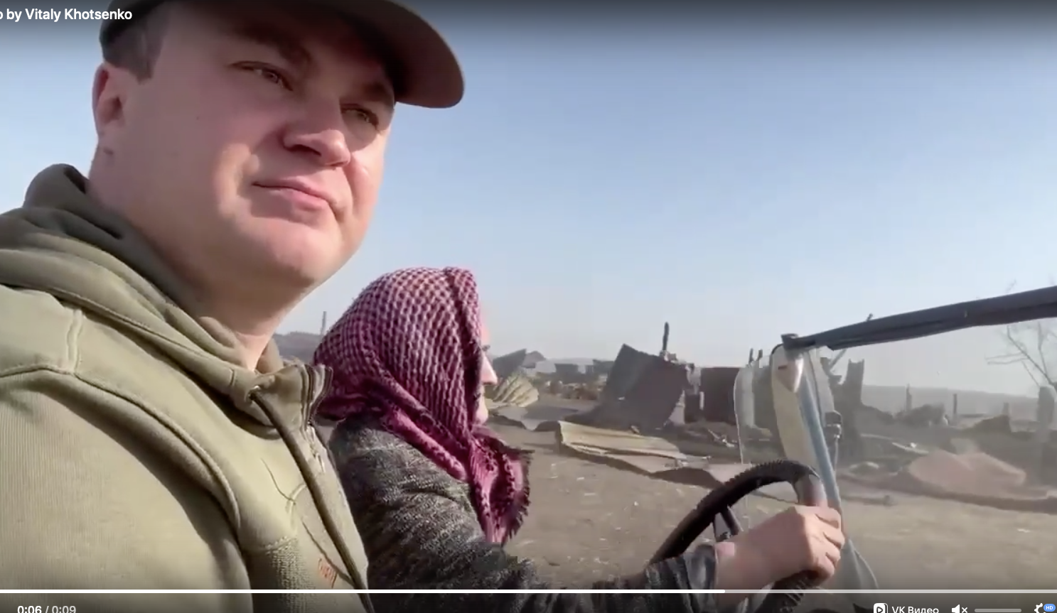 Российская пенсионерка покатала врио губернатора по сгоревшему селу на УАЗе Пожилая россиянка покатала временно исполняющего обязанности губернатора Омской области Виталия Хоценко по сгоревшему селу на УАЗе. Видео из поездки опубликовано в Telegram-канале главы региона.