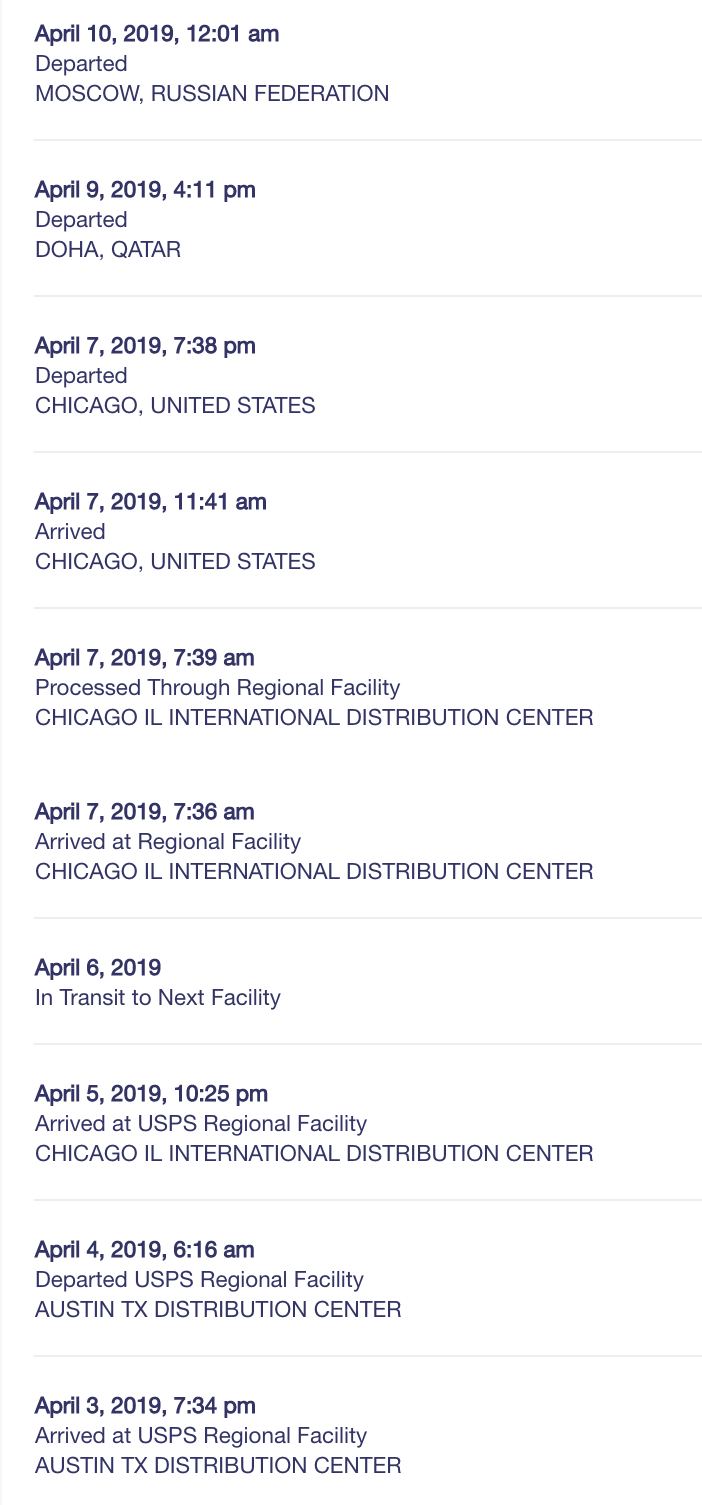 8 мая три отправила своим . Первая добралась 16 того мая ;вторая 18 мая ;третья 20 мая . Как раз из Чикаго вылетели 14 го мая . Не знаю что за компания DOHA,QATAR. Ей отправляли . Потом Домодедово ,Казанский ,Московский АСЦ . И дальше поехали к нам в область . Очень все быстро там прошло . Здесь мурыжили долго .
