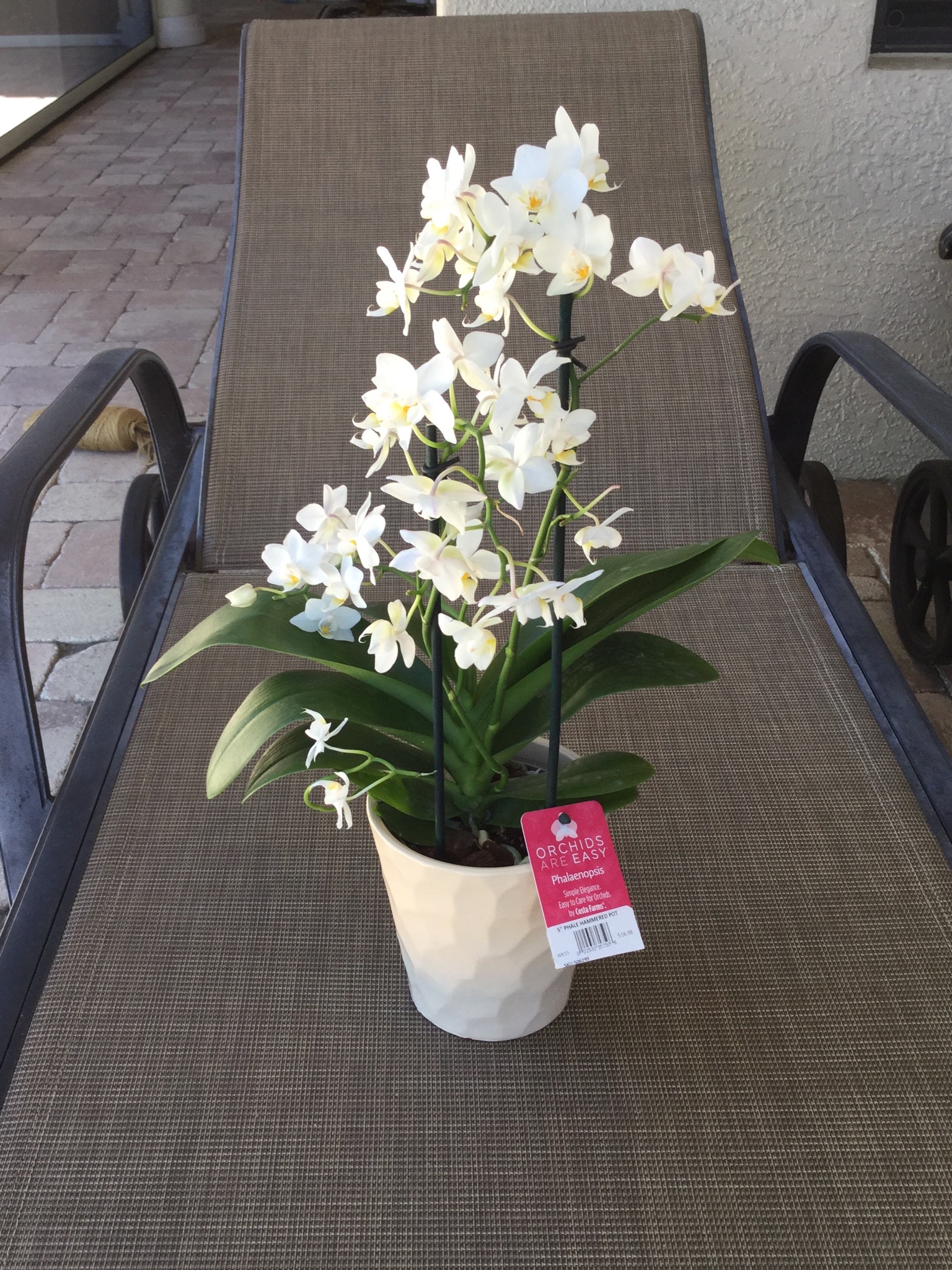 У меня такая есть. Правда, покупала с уценкой, за $6. Обожаю. Цветет долго и много, целым букетом. И листья у нее "букетом" : новые побеги идут во все стороны, я их не обрезаю. Раз так растет - ну и пусть. Посажу в бОльшую корзину. Вот недавно кот за белкой охотился, и тот и другой скакали по всем растюшечкам. У этой орхи обломили несколько цветоносиков. Так она все равно пышная , еще много осталось.