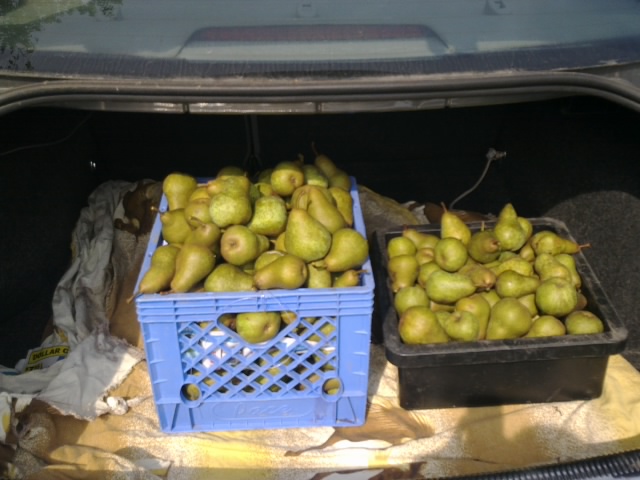 у друзей груша зелены плоды. вкусная. я вчера крутила джем и мармелад пол дня.. оч вкусно. только банки всетакине дешевые еще целый ящик остался)))) а если все груши собратьс ее дерева-то можно будет форд350 сзади весь загрузить..запросто