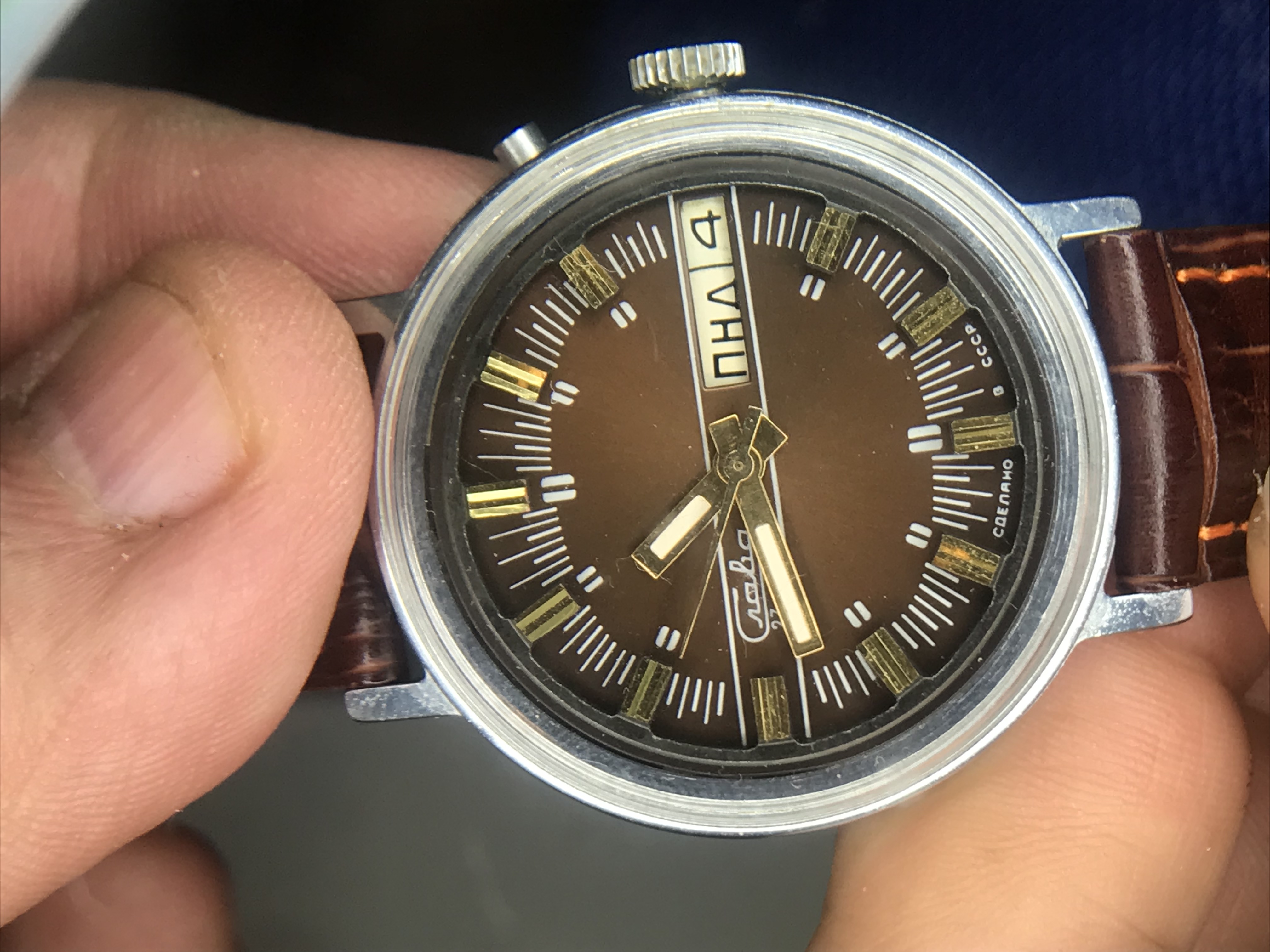 Дед ему двое часов подарил. Одни -швейцарские, золотые. Но эти - таки реликвия, сделано в СССР :-))