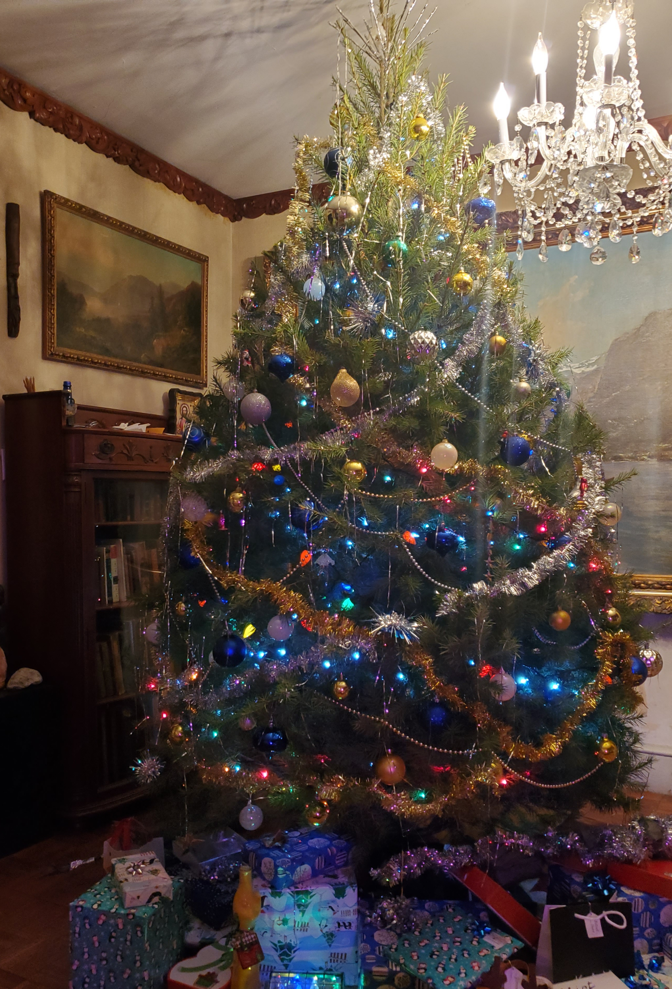 Украшена по-старому, под интерьер, который тоже не молод, как и хозяева). Игралась несколько лет в современные елки, они не подходят дому. Но рекомендуюмых цветов придерживаюсь ради игры. В этом году предлагались синие зеленые золотые и серебрянные украшения. Честно говоря, я согласна с теми, кто сказал они офисные, хоть и шикарные. Дома хороши елки с игрушками разных эпох, лет, семей, если есть дети, то их цепочки всякие, неуклюжие поделки. Приятно достать игрушку с историей, как со старым знакомым встретиться - привет, курилка, еще год проживем вместе)