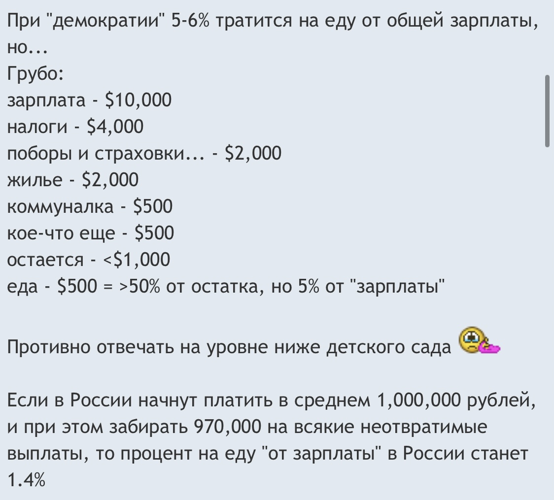 Jaxi писал(а): Azalia писал(а): бухгалтер писал(а): Ну конечно, кроме вас никто жизни в России не знает. Я там каждый год! Вы тоже так часто там бывали за последние 17 лет? Кто бы мне говорил про знание жизни... Я как раз та, кто все там знает. Последние полгода там провела. Вы тоже там полгода живете? Я не знаю, какая пенсия у моего брата с женой. Но им помогает то, что они унаследовали квартиры от родителей, потом продавали-перекручивали, себе улучшили жильё, помогли своему сыну купить более просторное жилье ( им тоже в наследство квартира бабушки жены досталась) - и на сдачу есть две квартиры в итоге. Также они дачу имеют, вот её они долго строили не торопясь ещё когда более менее молодые были. Сейчас все фрукты/ягоды/овощи оттуда, ещё и детям с внуками хватает, садоводы они знатные. Ну и выезжают на летний отдых они очень редко. Не жалуются, довольны жизнью, справляются с расходами. Да вариаций разных много. Я никого бедствующих, даже в провинции не знаю. Это раньше в 55-60 уходили на пенсию,а сейчас все пенсию получают и работают. Если здоровье есть, как раз самое "хлебное" время. Вот кто 12 тысяч пенсию получает, работать не может и детей нет или не помогают,тогда-да свести концы с концами, что называется. Также, как здесь на $1500 примерно.  Угу , большие цифры , а толку почти нет . Для молодёжи тяжко , конечно, сейчас