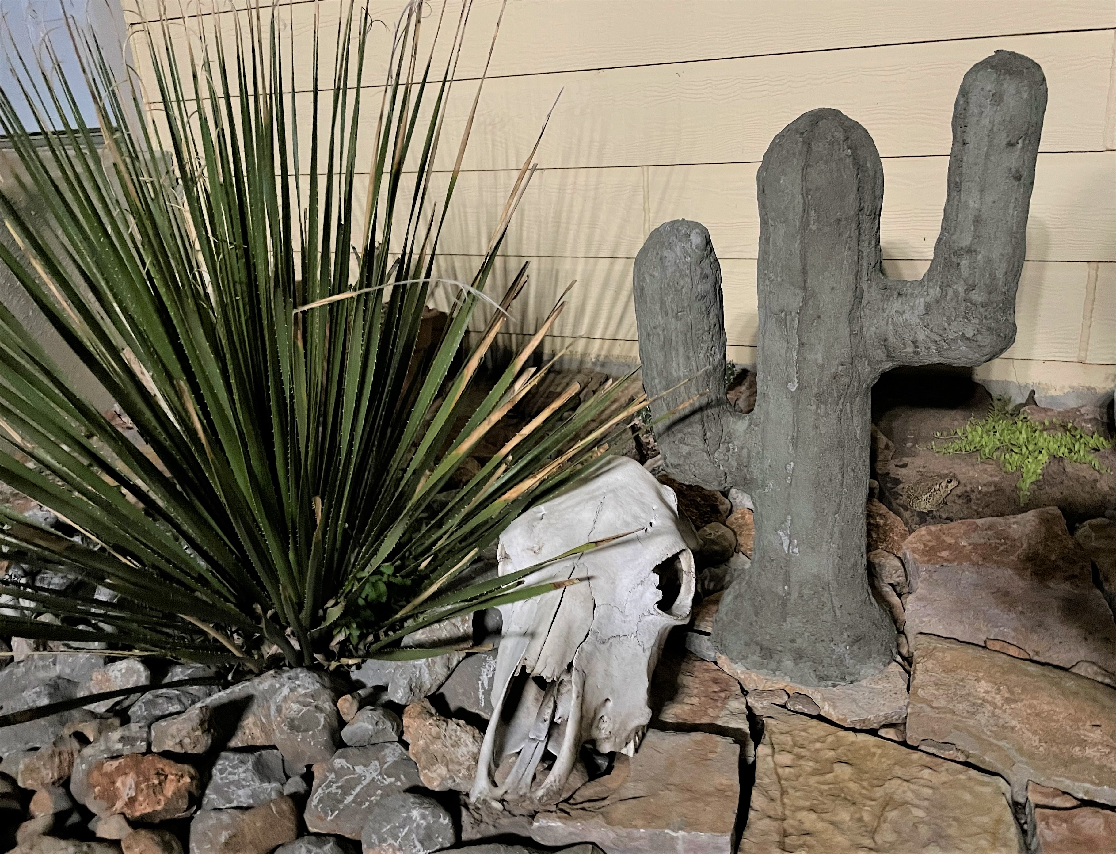 Девушки, я тоже вот с цементом наконец-то поразвлекалась разумеется, ничего полезного не сделала, но теперь у меня есть большой аризонский кактус Saguaro  ну не такой большой, чтоб перепутать с настоящим, но все же больше всех моих остальных. Как дурак с фантиком, таскала его туда и сюда, и еще куда-то - искала, где ж ему будет краше всего *расти* Пока оставила около черепушки. дальше видно будет. Он не особо тяжелый, пустотелый. Не знаю - имеет смысл его красить, или лучше потренироваться на кошках...в смысле на чем-то небольшом, увидеть результат чтоб.