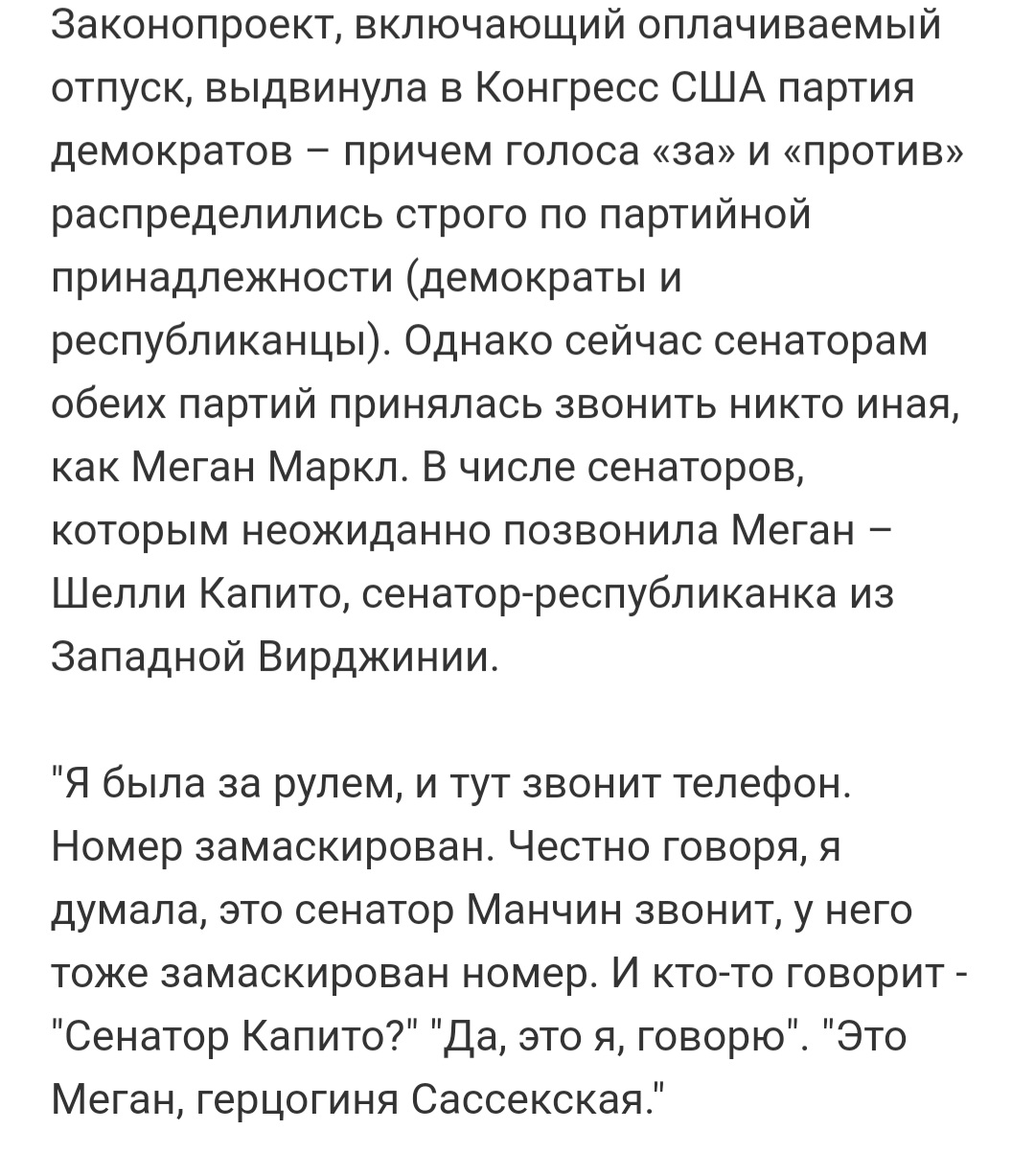 mrv71 писал(а): Кто это в наше время отвечает на незнакомые номера, это наверняка фейк.  Да нет, отвечают. Скоро до Бидона доберется `This is the Duchess of Sussex': Meghan Markle is now cold calling Republican Senators on their private numbers and using her royal title to lobby for paid paternity leave: Wants to be part of a 'working group' to formulate policy The Duchess of Sussex was encouraged to pick up the phone by Kristen Gillibrand, senator for New York and an advocate for paid parental leave Gillibrand has confirmed that she gave Markle the private phone numbers of Senator Susan Collins, a Republican from Maine, and Senator Shelley Moore Capito, a Republican representing West Virginia Both women told Politico they were shocked at being called by Markle out of the blue, noting that she used her royal title to lobby for change Gillibrand added that Markle now wants to be on a 'working group' that is pushing to get legislation passed The move is the latest in a flurry of political activism from the Los Angeles-born duchess https://www.dailymail.co.uk/news/article-10163679/Meghan-Markle-called-two-senators-lobby-vote-favor-paid-parental-leave.html