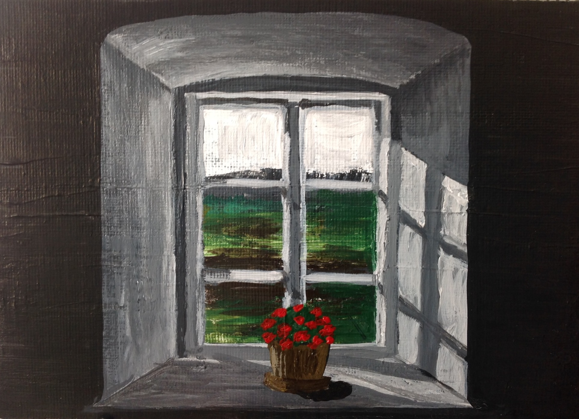 Немного не абстракта, мое. Каюсь, с чей-то фотки. Жаль, что маленькая 5"х7". Думаю повторить на большом холсте, изменив. Напоминает мне окно моего детства.