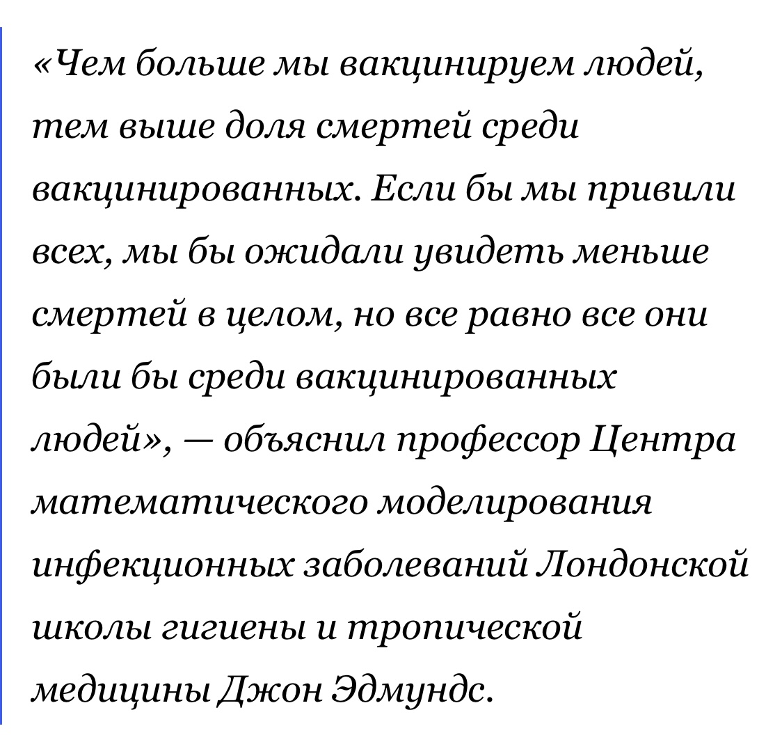 monaliza писал(а): Логично. Monaliza, вы так многозначительно притащили сюда высказывание Британского ученого На Русском языке, с одноклассников что ль ? Но этот John Edmunds ничего подобного не говорил ни на русском языке ни на Английском. А, наоборот.  призывает вакцинировагься Vaccinate children ‘as fast as we can’ to keep schools open, top government adviser says https://www.independent.co.uk/news/uk/politics/covid-vaccine-children-schools-open-b1805239.html#comments-area