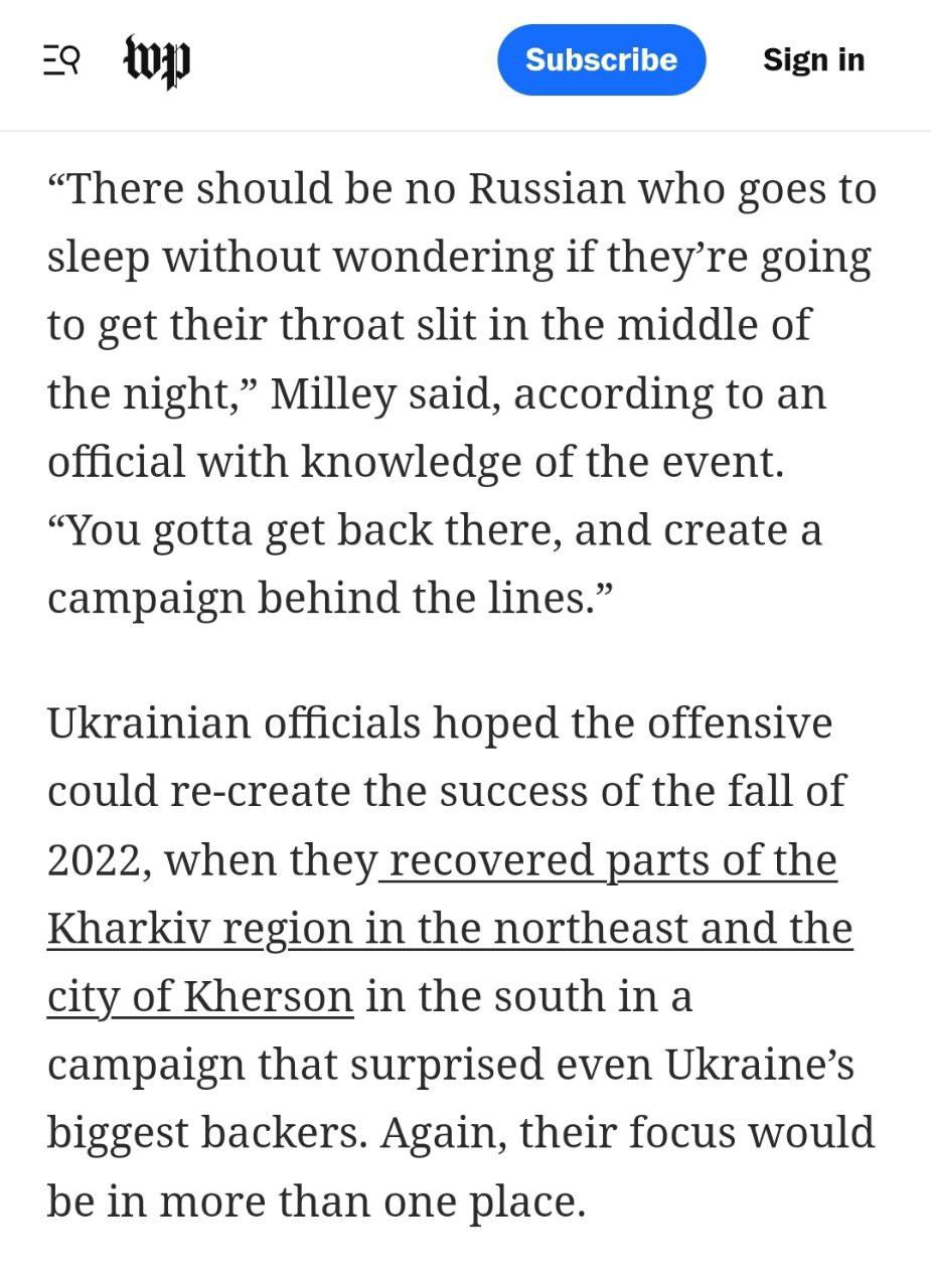 Цитата: «Не должно быть ни одного русского, который ложился бы спать, не задаваясь вопросом, не перережут ли ему горло посреди ночи», - сказал Милли, по словам чиновника, осведомленного об этом событии. «Вы должны вернуться туда и организовать кампанию в тылу»: Глава объединенных штабов США Марк Милли - 4 декабря 2023 года Больные, больные на всю голову...