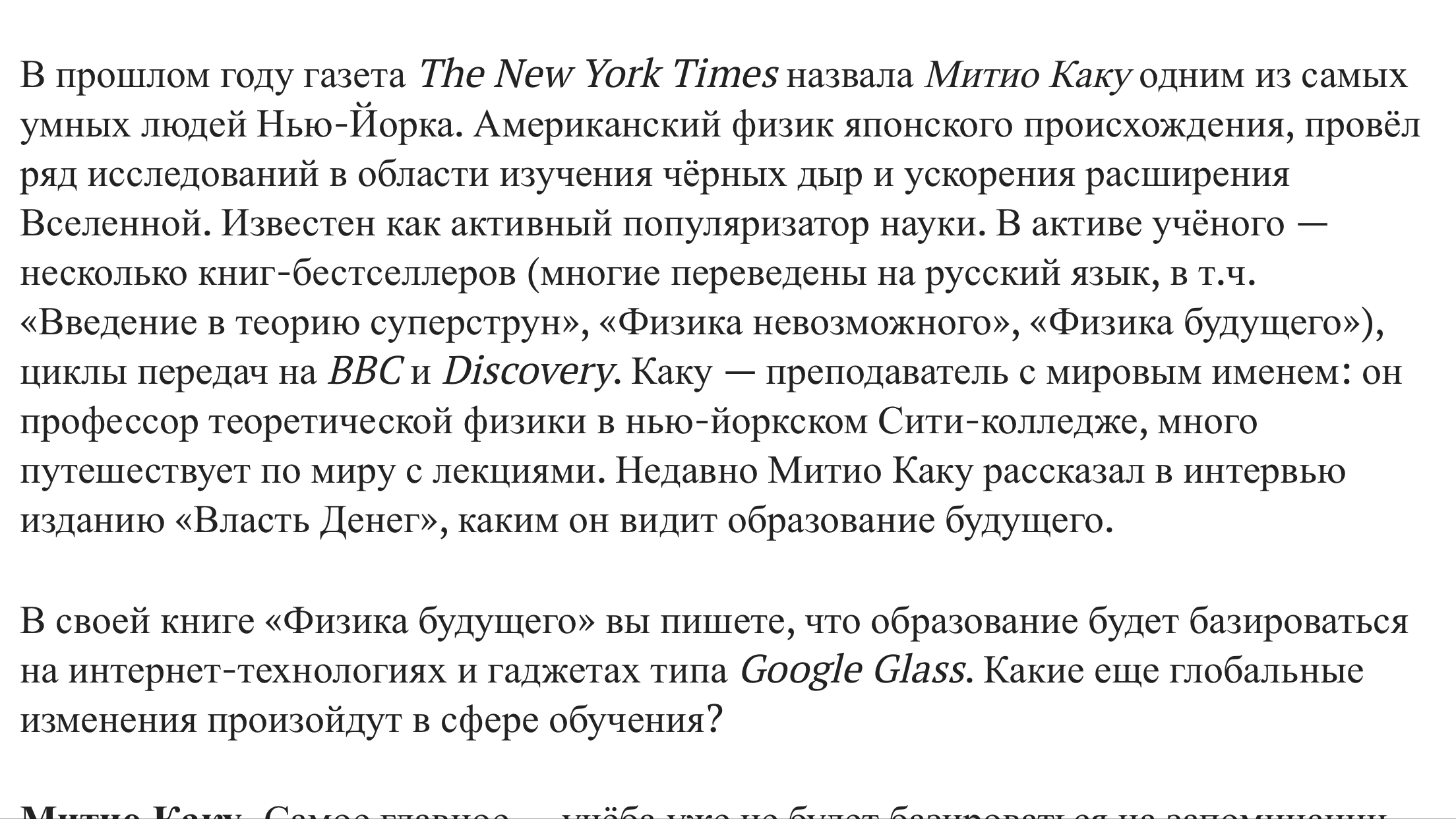Интересно статья написана, скоро все увидим, ведь 10-15 лет прогнозируется, очень нравится эта картинка которую он нарисовал для будущего :) Давно хочу прочитать хотя бы одну книгу этого Митио Каку. Люди наверное станут еще меньше общаться друг с другом, а может и нет. Но вот что хочется отметить, то что там описано уже давно существует в плане того, что образование, по крайней мере для определенного типа людей, становится ненужным. Может оно конечно всегда так было и я этого не замечала. Но по себе вижу, что у меня нет ни доверия ни к образованию как корочке, ни к образовательным institutions как административным учереждениям, т.к. работу как таковую я не ищу с основанием на то какое у меня образование. Если надо будет на кого-то работать, то буду устраиваться на основе существующих знаний и навыков, а не на том чему я там где-то когда-то училась (и непонятно научилась ли). А пока что: захотела - купила курс, научилась чему-то, применяю, опять пошла поучилась, потом опять. Т.е. нахожу курсы я сама, выбираю сама, все что мне нужно найду и узнаю и никакие колледжи мне для этого не нужны. Может это потому что я ориентирована на работу только на себя и никак не на кого-то... В общем, то о чем говористя в статье давно уже на себе ощущаю.